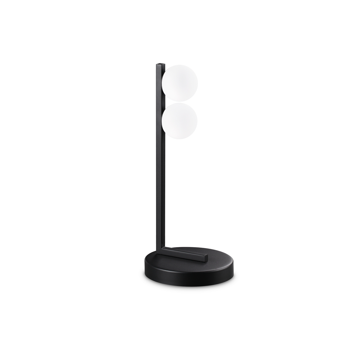 Abatjour Contemporanea Ping Pong Metallo Nero Led Integrato 6W 3000K IP20 A++ h.35 D. L.15 P.15 Lampadina inclusa. Montatura in metallo rifinito con vernice a polveri. Diffusori con sfere in acrilico trasparente satinato. Driver integrato. Finiture: bianco, nero, ottone spazzolato.