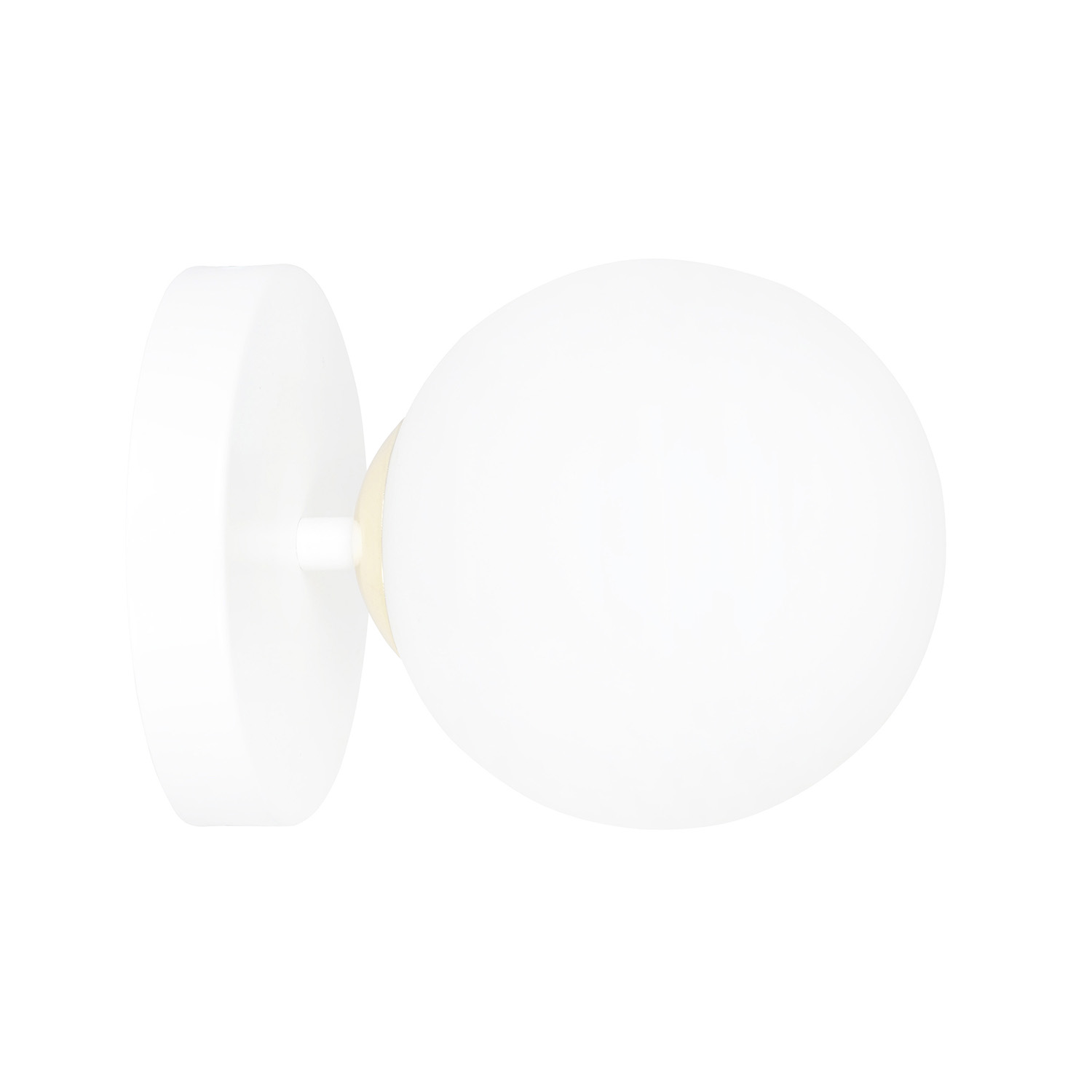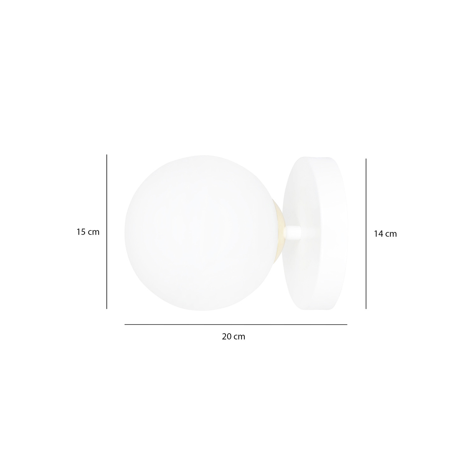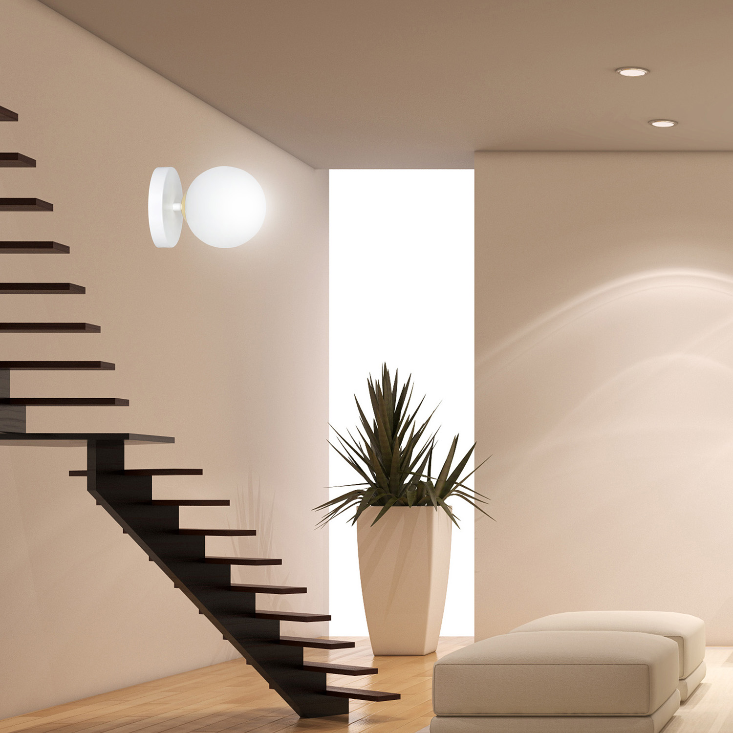 Applique 1 luce realizzata con base rotonda in metallo bianco con braccio e paralume in vetro opalino di forma sferica con elemento decorativo dorato. Senza tempo ed elegante, si adatterà a qualsiasi tipo di interno. La delicata tonalità lattiginosa aggiunge eleganza e leggerezza. Disponibile in bianco o nero.