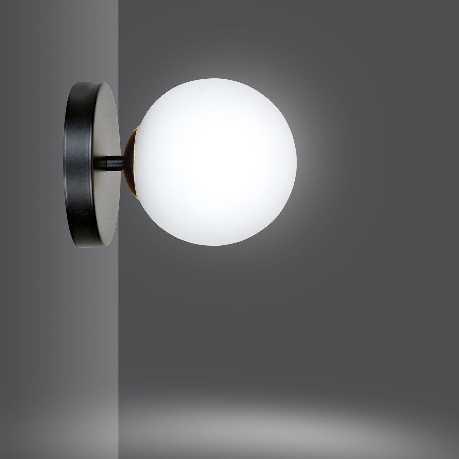 Applique 1 luce realizzata con base rotonda in metallo di colore nero con braccio e paralume in vetro opalino di forma sferica con elemento decorativo dorato. Senza tempo ed elegante, si adatterà a qualsiasi tipo di interno. La delicata tonalità lattiginosa aggiunge eleganza e leggerezza. Disponibile in bianco o nero.
