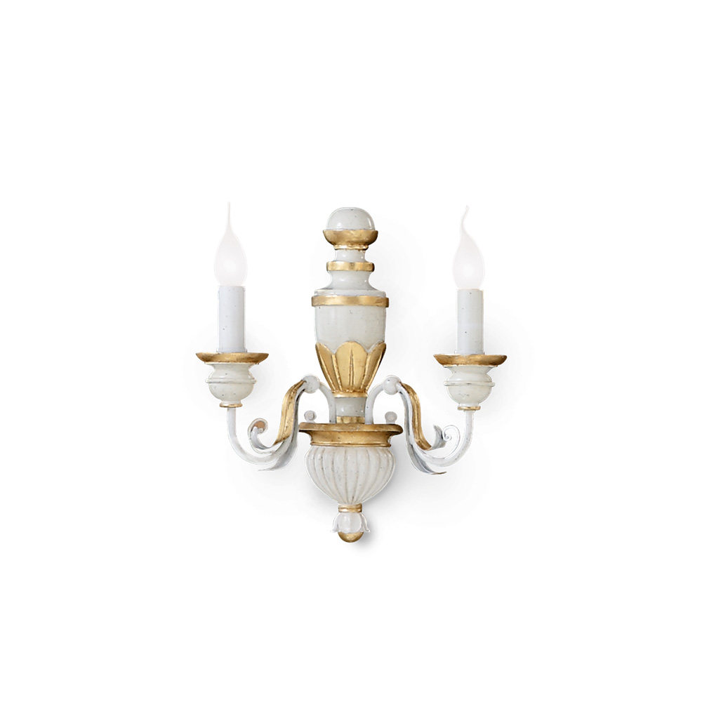 Collezione FIRENZEEMOZIONI CLASSICHEApplique a 2 luci con corpo luce in resina. Bracci e foglie in metallo modellato artigianalmente. Decorato a mano con foglia d’or..