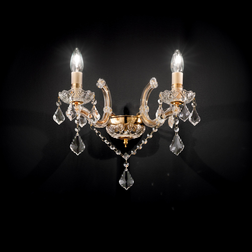 Collezione FLORIANCRISTALLI PER IL TUO LIVINGApplique a 2 luci con montatura in metallo dorato con elementi decorativi in vetro trasparente. Pendagli con ottagoni e ..