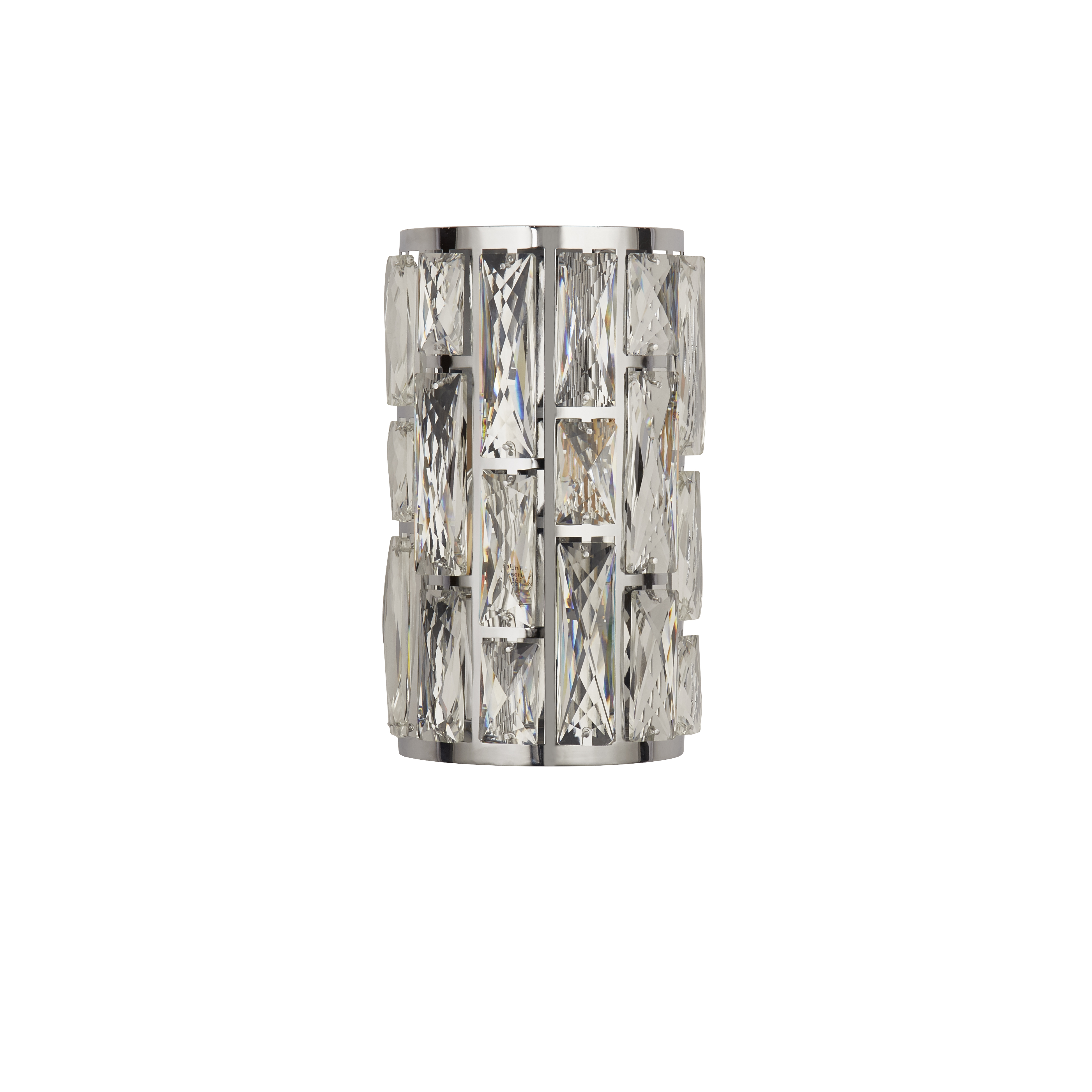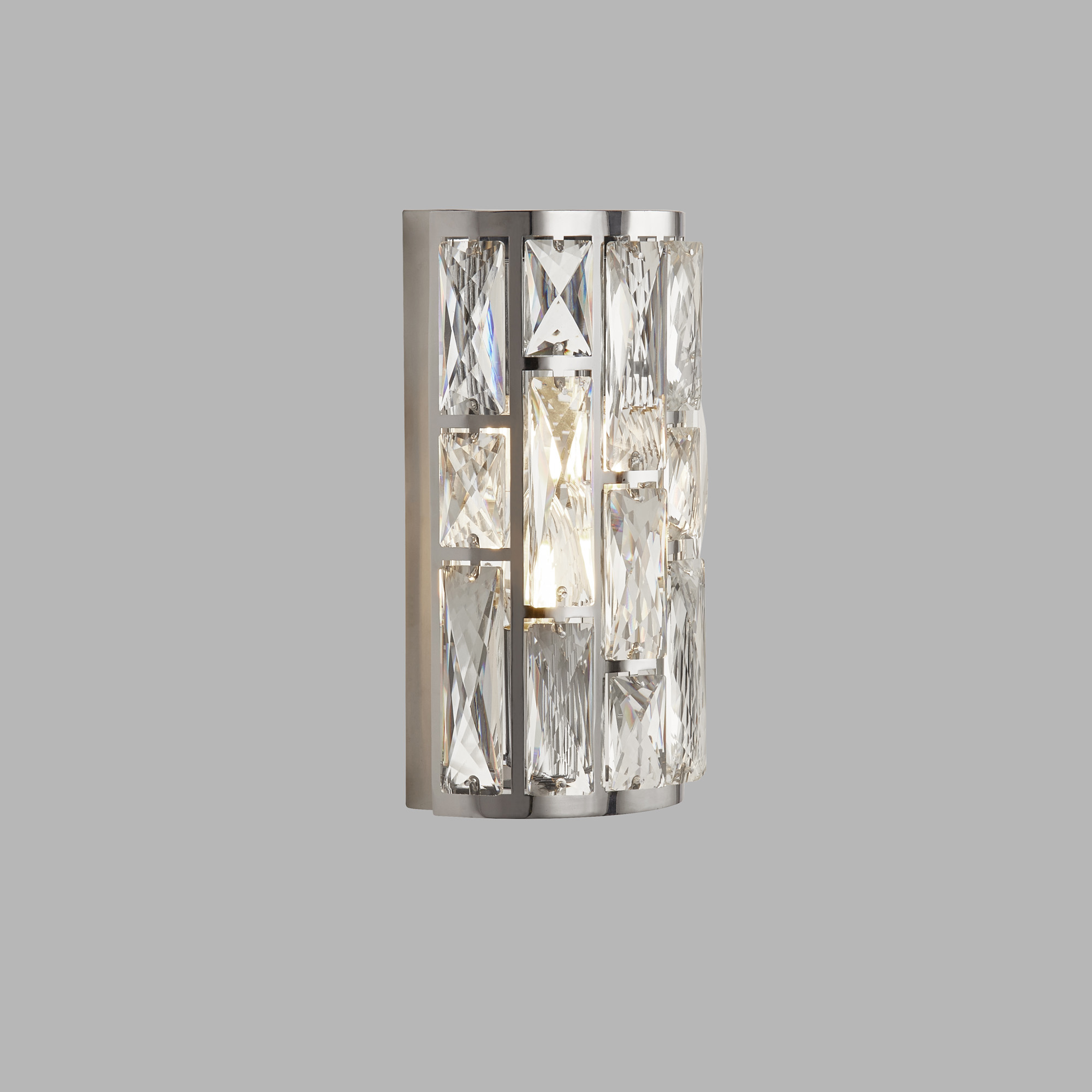 Lampada da parete Bijou è rifinita in cromo lucido e ha un paralume arrotondato in vetro cristallo con forme in vetro trasparente sfaccettato intarsiato. L'applique è dotata di funzione di regolazione della luminosità ed è un pezzo ideale per un corridoio o un'area lounge.