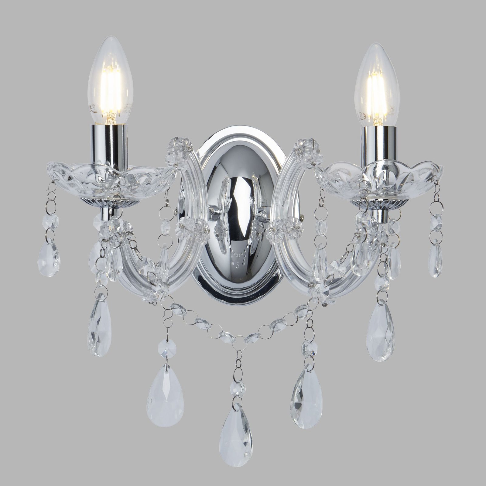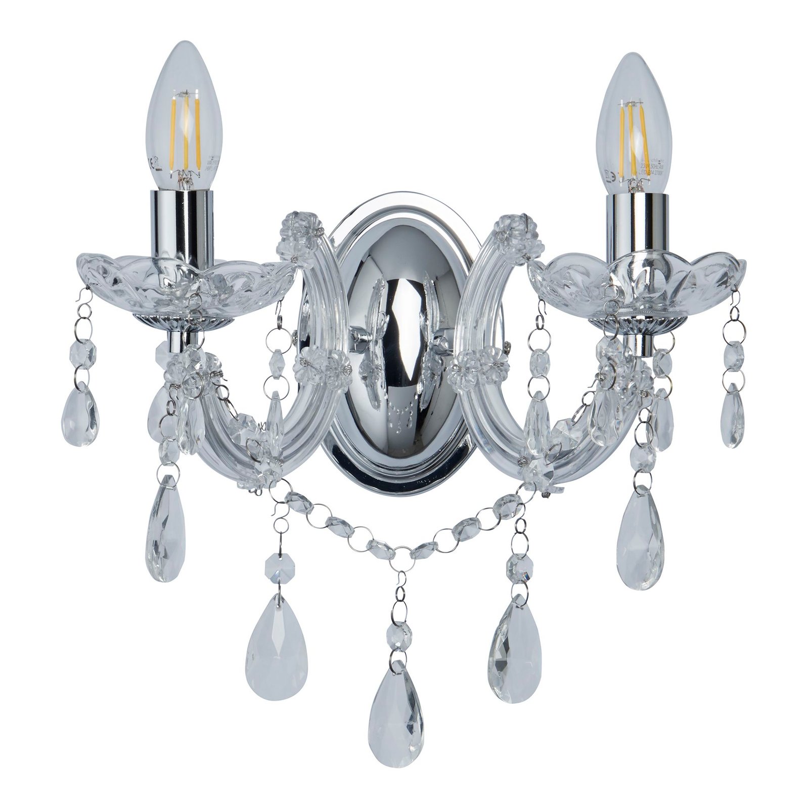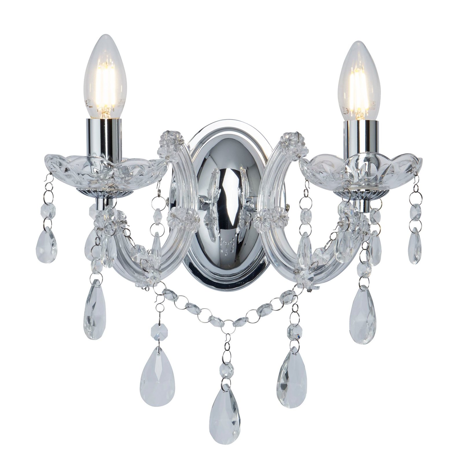 Collezione Marie ThereseSPETTACOLO SCINTILLANTELo splendido supporto da parete Marie Therese a 2 luci con finitura cromata lucida ha uno stile aristocratico. Perfett..