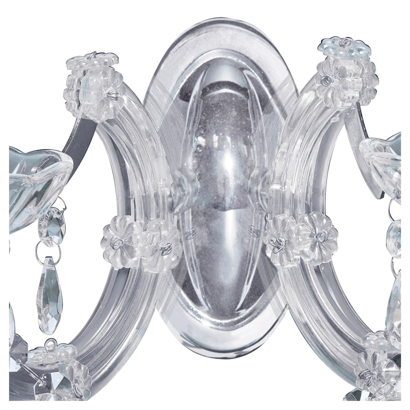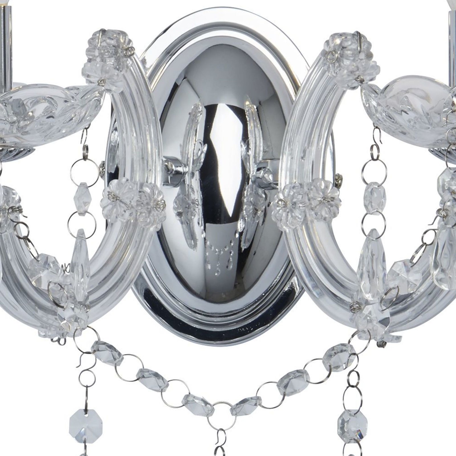Lo splendido supporto da parete Marie Therese a 2 luci con finitura cromata lucida ha uno stile aristocratico. Perfetto per aggiungere un tocco teatrale a qualsiasi spazio abitativo. La tradizionale staffa di forma ovale con bracci a forma di "C" e bellissime applique floreali sono lussuosamente ornate con gocce di cristallo per creare un'affascinante fonte di luce aggiuntiva per ogni stanza.