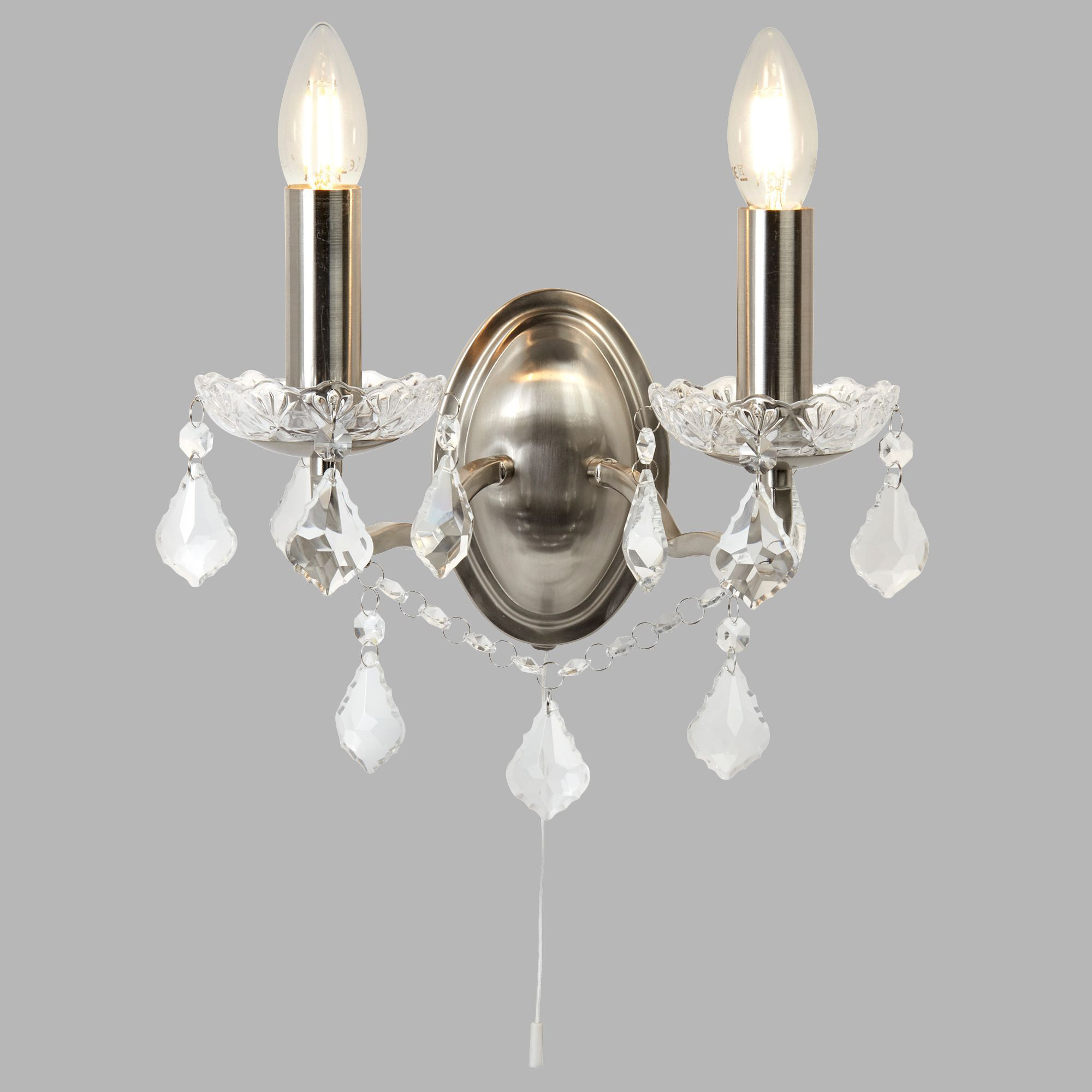Questa opulenta staffa da parete Paris 2 luci è un pezzo davvero elegante, composto da ornamenti abbaglianti. Le bellissime gocce e le finiture in cristallo trasparente sono sospese dal corpo in argento satinato per creare una sensazione di lusso. Posiziona questa staffa da parete in un corridoio o sulla parete del soggiorno.