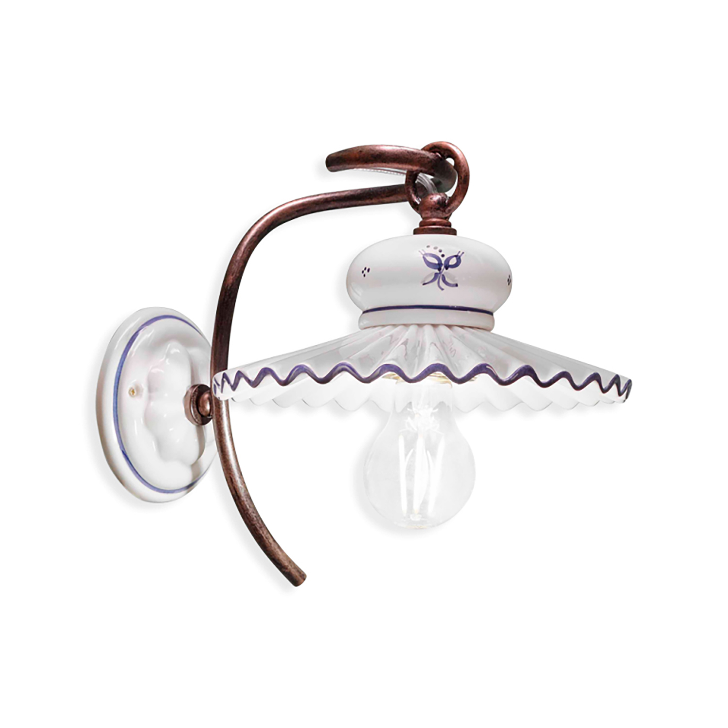 Applique a braccio 1 Luce E14 in ceramica decoro Filo blu con montatura nero sfumato rame frutto di una lavorazione eseguita a mano.. L'equilibrio tra materiali di alta qualità e artigianato meticoloso rende questo prodotto un pezzo unico che aggiunge un tocco di raffinatezza e stile a qualsiasi spazio. Perfetto per illuminare con classe salotti, sale da pranzo o ambienti commerciali, questo prodotto diventa il punto focale dell'arredamento, creando un'atmosfera accogliente e sofisticata. Lasciati sedurre dalla sua bellezza senza tempo e regala al tuo ambiente un'illuminazione di classe. I decori si possono scegliere in base ai propri gusti e/o esigenze. E' disponibile anche nei colori Argento, Bianco, Bianco Sfumato Argento, Bianco Sfumato Oro, Nero, Nero Sfumato Argento, Nero Sfumato Oro, Nero Sfumato Rame, Ruggine, Verde Sfumato Oro, Ottone Brunito, Ottone Satinato, Nickel Satinato, Cromo.