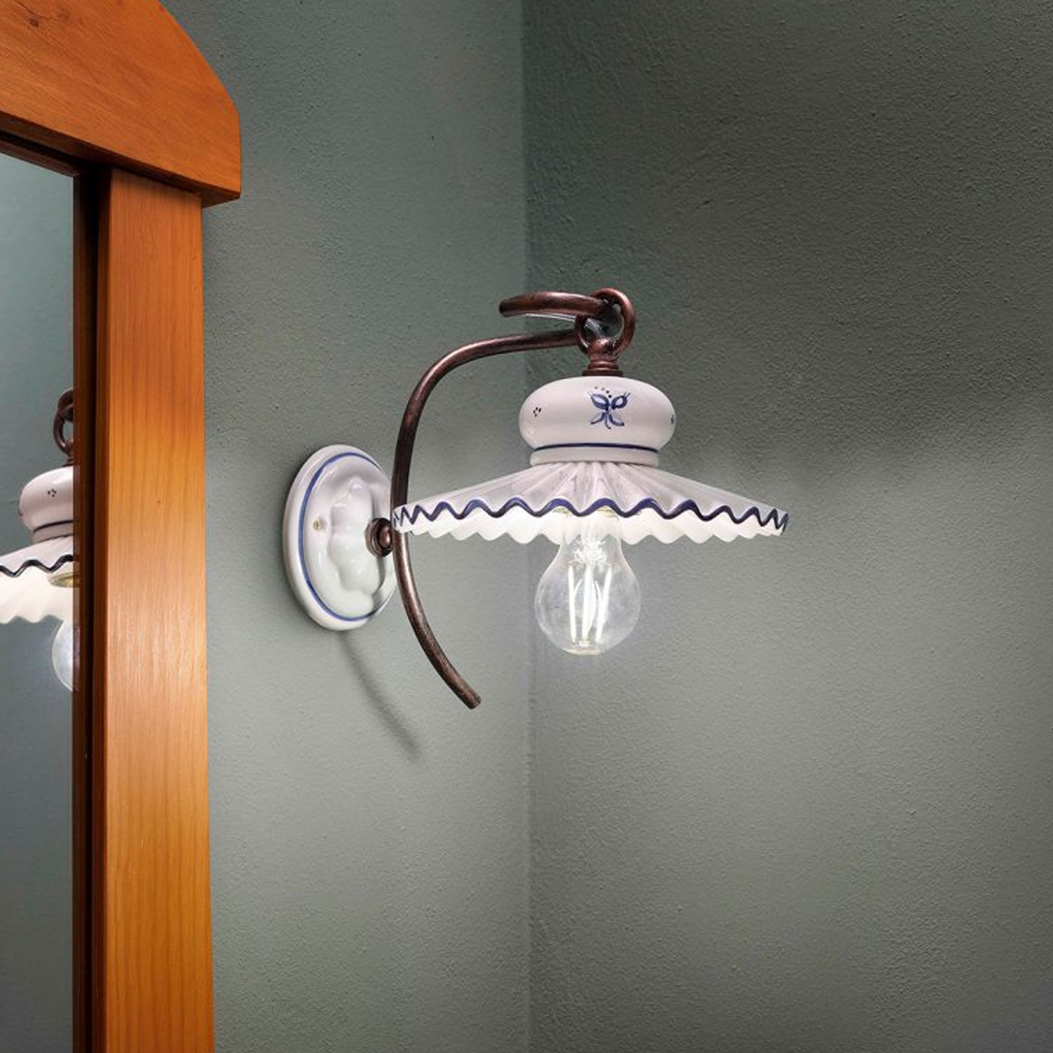 Collezione ROMALUCE CHE DANZA NELL'AMBIENTE CREANDO MAGIAApplique a braccio 1 Luce E14 diametro 14 cm in ceramica decoro Filo verde con montatura nero sfumato rame f..