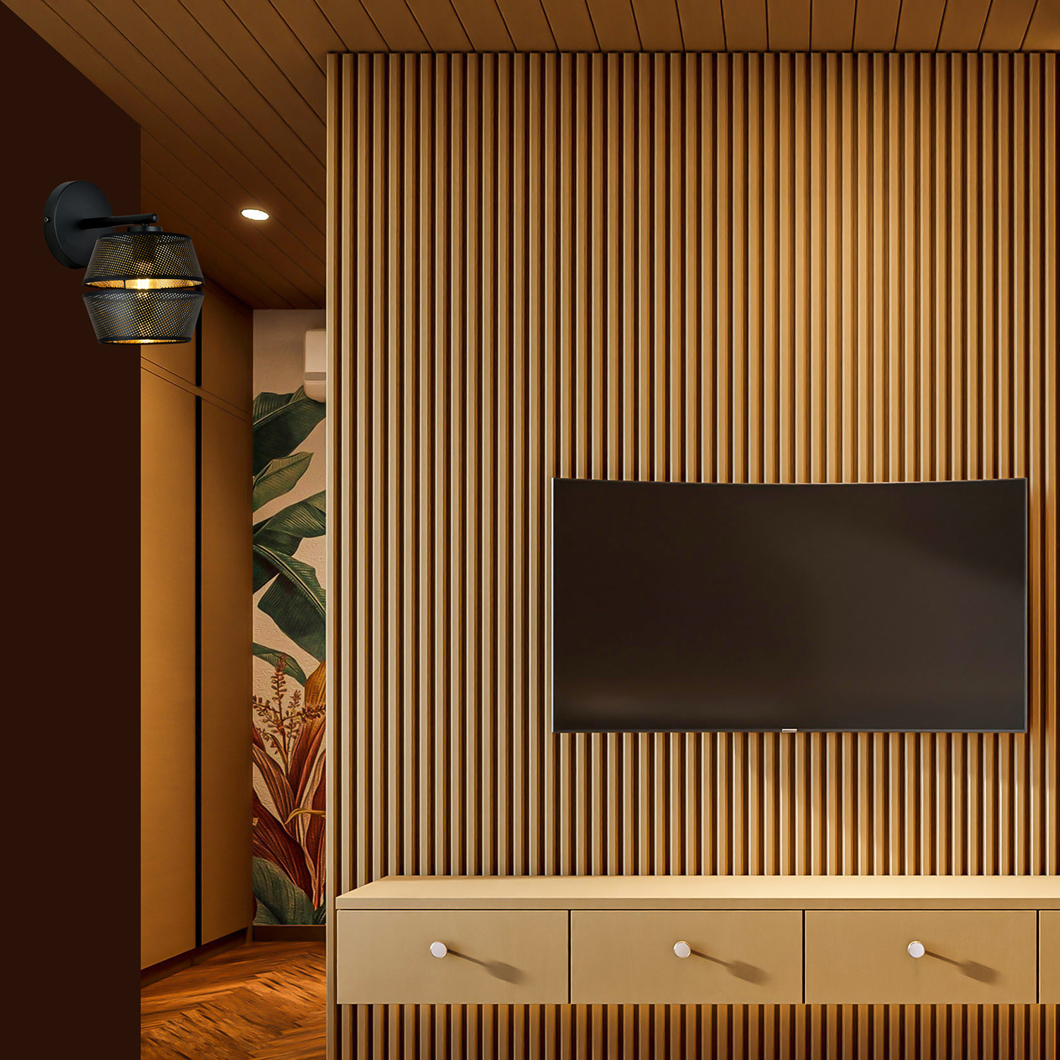 Applique a 1 luce con base in metallo nero e diffusore in rete metallica nero all'esterno e oro all'interno.. Il suo paralume originale con interno dorato conferisce un carattere unico alla stanza. Creando un'atmosfera magica e suggestiva, irradia un calore sensuale. La costruzione semplice e l'elegante palette di colori garantiscono una perfetta armonia tra praticità e raffinatezza.