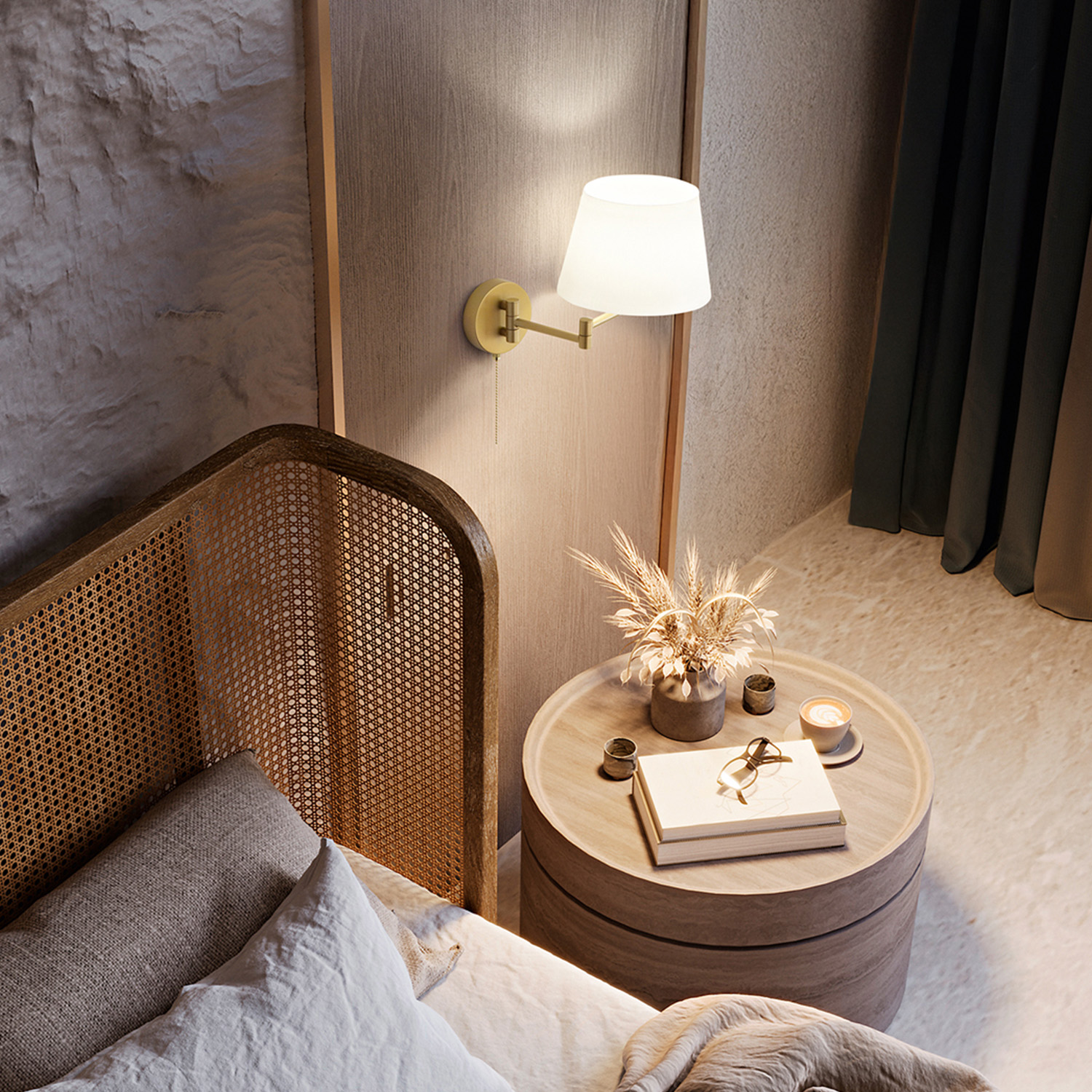 Collezione con struttura snodabile in metallo e alluminio verniciato a polvere nei vari colori. Paralume in tessuto, plastificato all'interno. Colore: oro opaco, paralume bianco L.38 x H.25 cm Paralume D.20 x H.14 cm 1 x E14 MAX 35W 220-240V 50/60Hz IP20 - Classe I Interruttore on/off a catenella sulla base