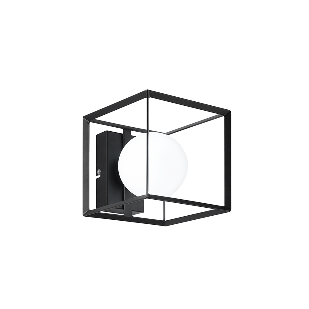 Applique realizzata in metallo verniciato di colore nero, forma cubica e il design moderno e lineare la rendono adatta a qualsiasi tipo di ambiente. La luce emessa dalla lampada si diffonde in modo uniforme grazie al diffusore opale in vetro satinato.