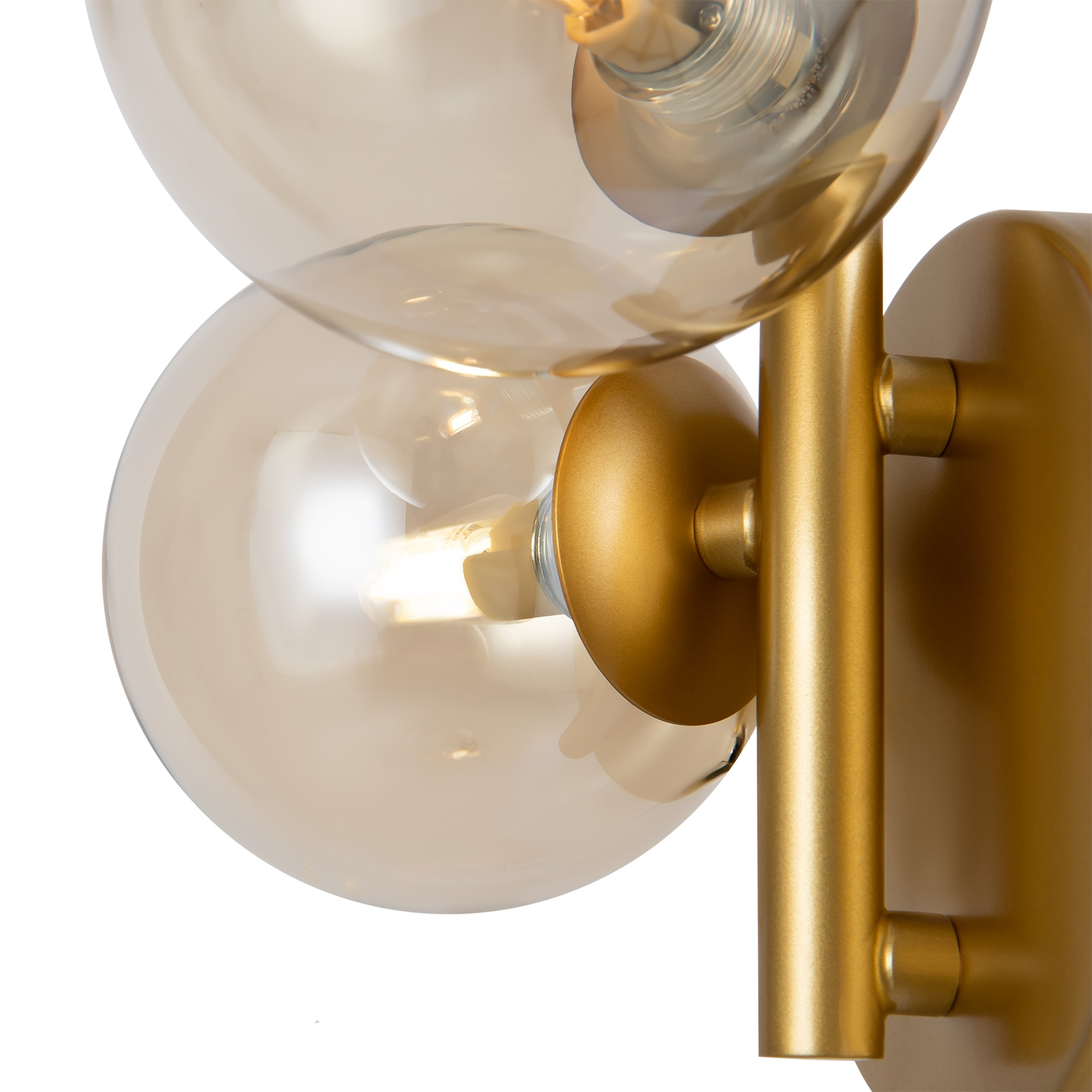 Applique contemporanea Dallas con struttura in metallo oro e 3 luci, dotato di diffusori in vetro soffiato cognac.. L'applique ispirata alla struttura molecolare conferisce a questo prodotto un aspetto moderno ed elegante. La sorgente luminosa utilizzata è una lampadina con attacco G9, che assicura un'illuminazione uniforme e diffusa. Questa applique è perfetto per illuminare grei ambienti, come soggiorni, sale conferenze e uffici.