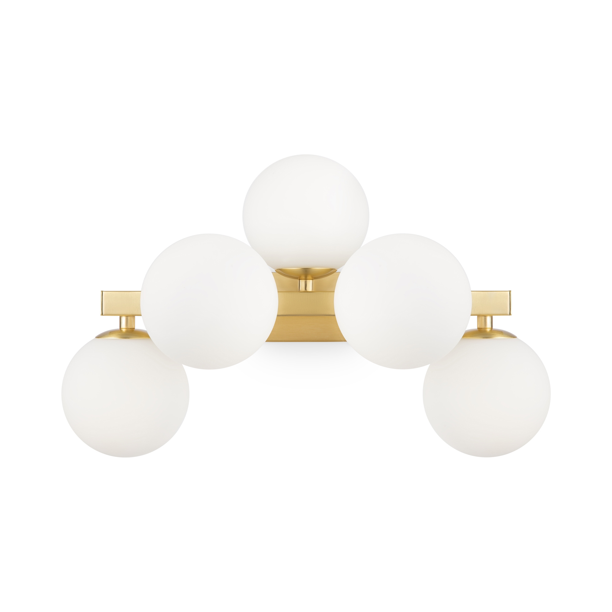 Applique contemporanea Dallas con struttura in metallo oro e 5 luci, dotato di diffusori in vetro soffiato bianco opaco.. L'applique ispirata alla struttura molecolare conferisce a questo prodotto un aspetto moderno ed elegante. La sorgente luminosa utilizzata è una lampadina con attacco G9, che assicura un'illuminazione uniforme e diffusa. Questa applique è perfetto per illuminare grei ambienti, come soggiorni, sale conferenze e uffici.