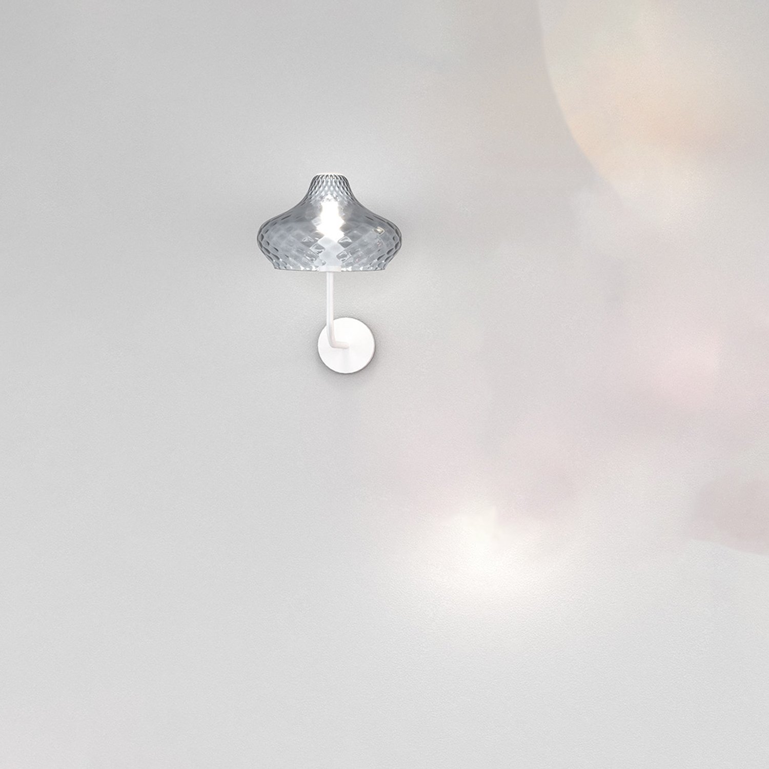 Collezione di lampade a sospensione composte da uno o più elementi in vetro soffiato regolabili in altezza. Gli elementi in vetro, disponibili in due dimensioni, sono caratterizzati da una lavorazione a rombi presente all'interno del vetro che ne arricchisce e valorizza il design. La serie viene completata da due modelli di lampade da parete, una da plafone e da una lampada da appoggio. Le finiture dei vetri sono ambra, rubino e zaffiro. Le strutture dei rosoni sono disponibili nelle finiture cromo, bianco e ottone satinato, mentre le finiture del portalampada sono unicamente di colore bianco.