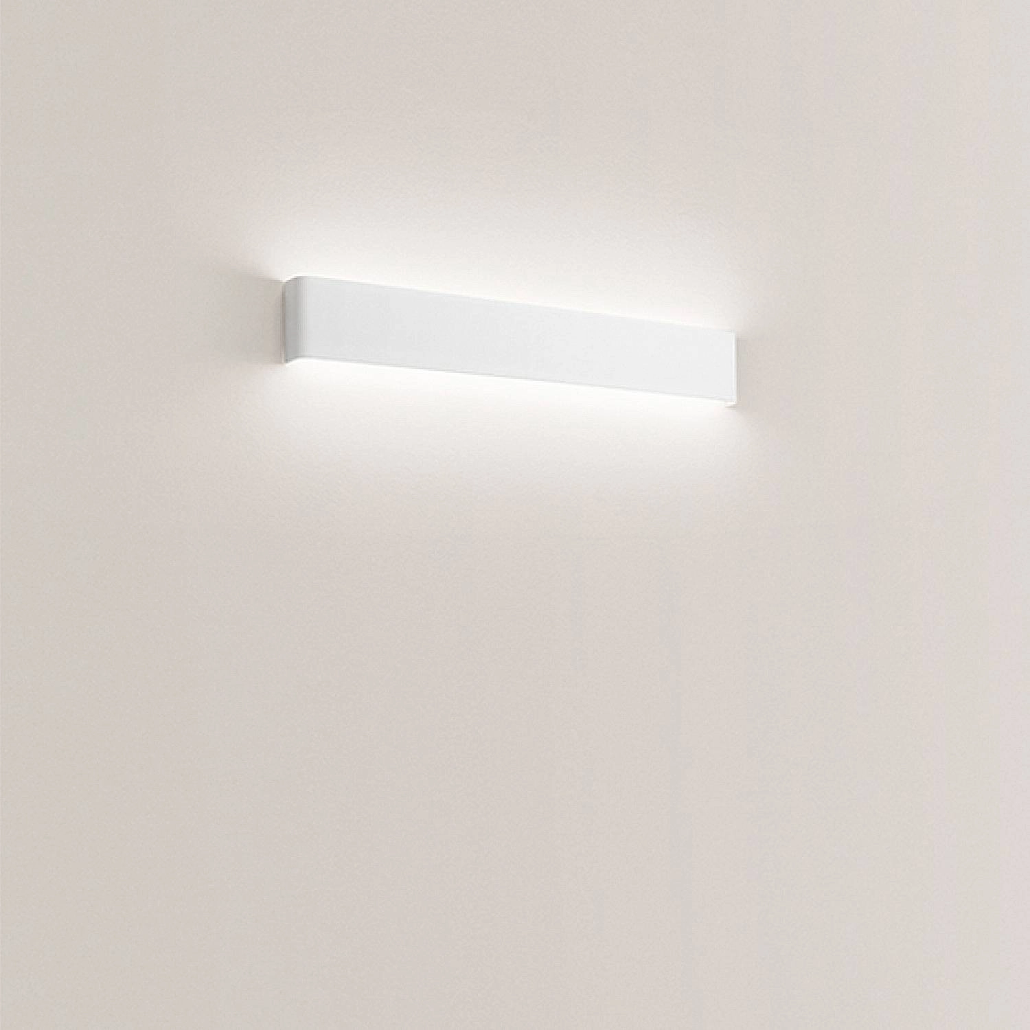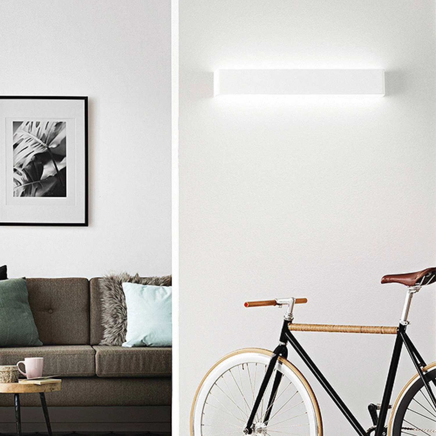 Applique in metallo bianco, forma rettangolare con una sottile linea di luce a LED lungo il bordo, che crea un effetto di illuminazione a doppio fascio. Grazie alla sua versatilità, si adatta perfettamente a qualsiasi tipo di arredamento, dal più classico al più contemporaneo.