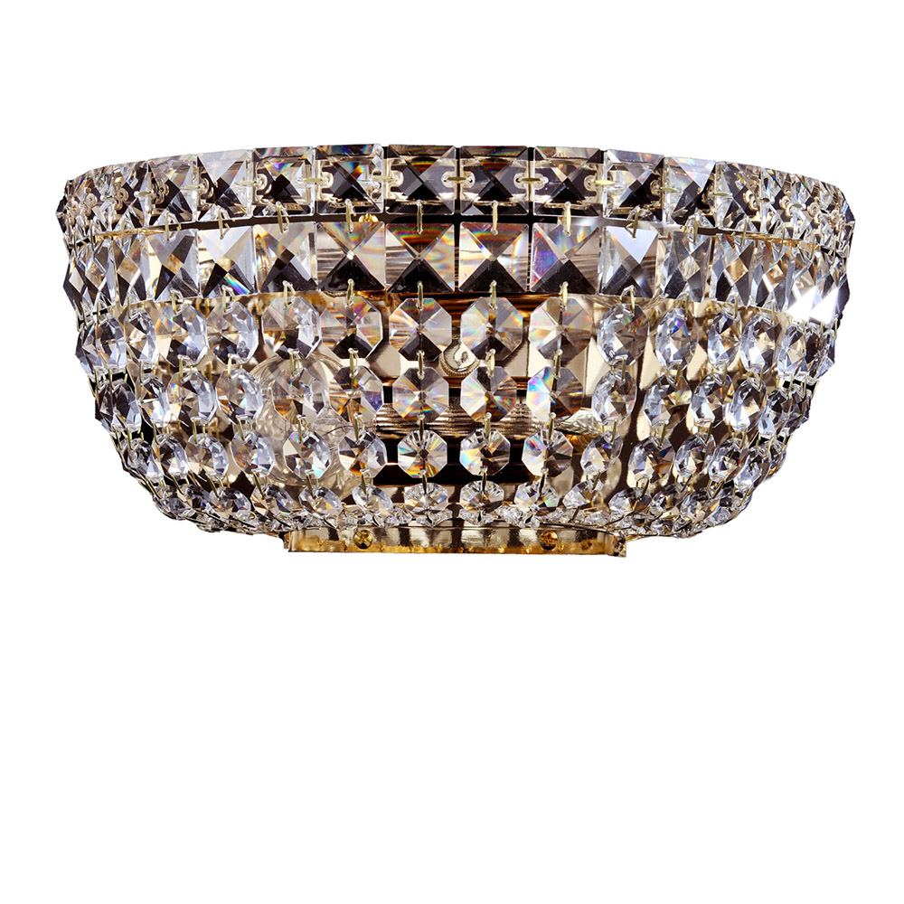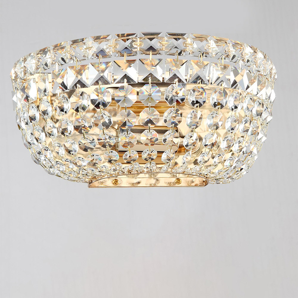 Collezione BasforL'ELEGANZA FRA METALLO E CRISTALLILa plafoniera contemporanea Basfor presenta una struttura in metallo di colore oro antico con 3 luci e un decoro i..
