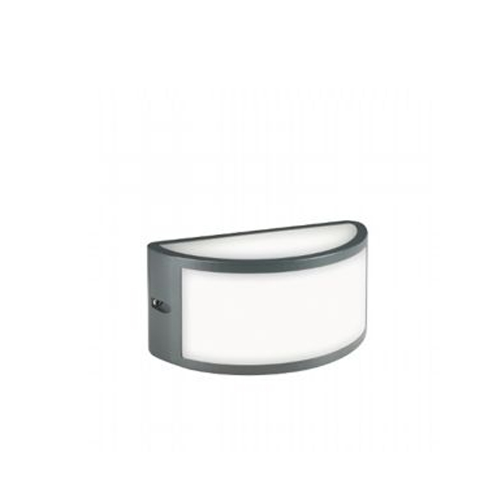 Applique in pressofusione di alluminio, color grigio goffrato, con diffusore in resina satinata.. Luce di qualità per ambienti esterni ed interni. Monta lampadina di altezza max 140mm. Alimentazione 230V. Grado di protezione IP54.