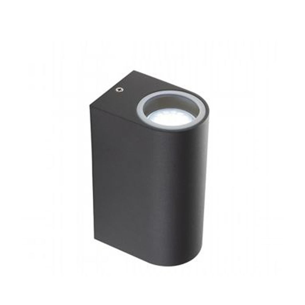 Applique a 2 luci con struttura in alluminio pressofuso color grigio e diffusori in vetro trasparente.. Porta lampada di altezza massima 76mm. Lampada GU10 da 35W inclusa. Pressacavo PG7. Alimentazione 230 V ~ 50 Hz.