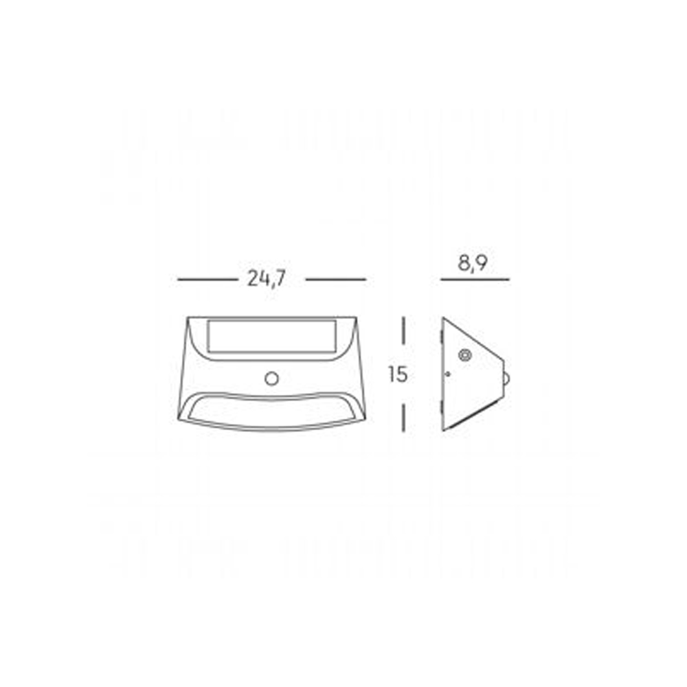 Applique solare in alluminio pressofuso.. Sensore di movimento e crepuscolare. Diffusore in resina opalina. Illuminazione con 24 LED SMD 2835. Consumo: 1,7W.