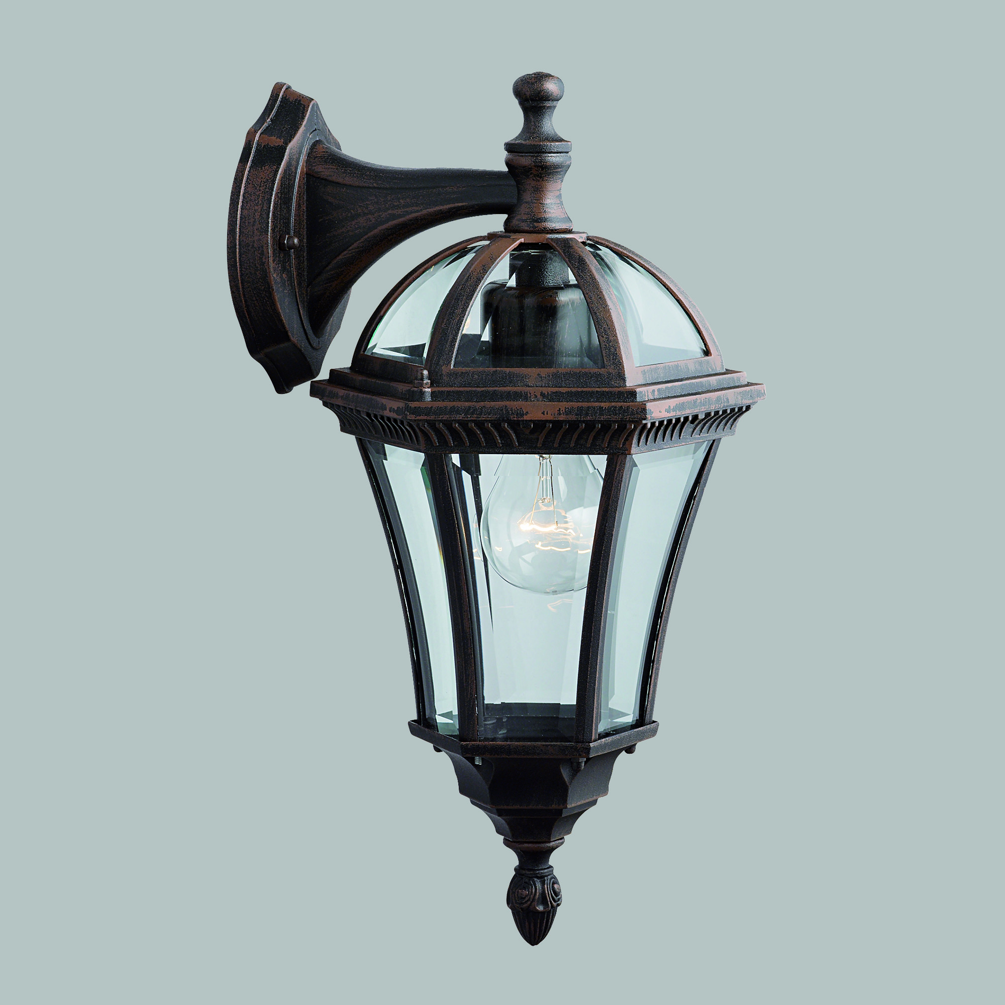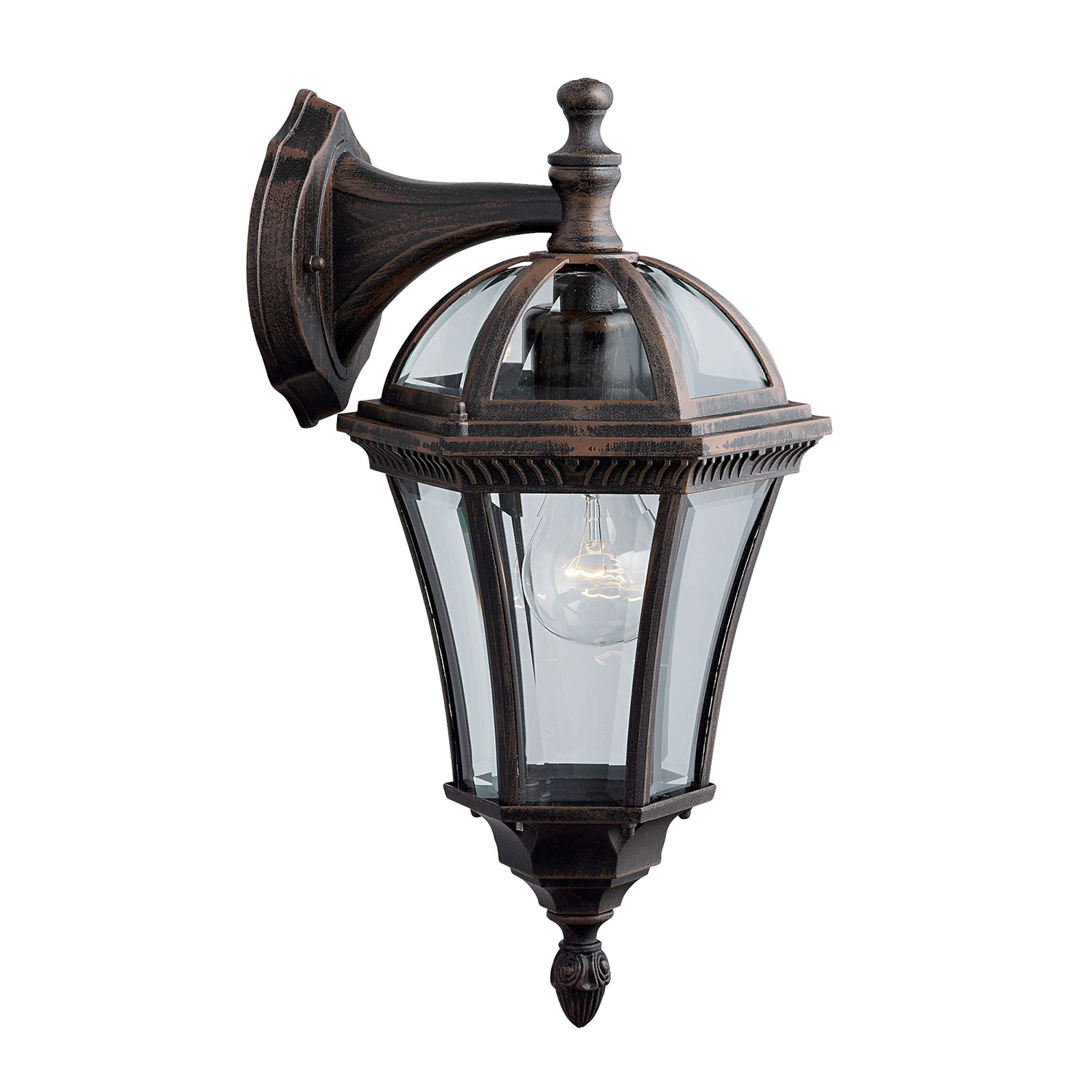 Una squisita staffa da parete per esterni a 1 luce con una finitura verniciata marrone rustico. Il downlight è realizzato in alluminio e vetro trasparente; ideale per illuminare il vostro portico o giardino creando un'atmosfera accogliente. Questo articolo è classificato IP44 e completamente resistente agli spruzzi d'acqua per proteggerlo dagli elementi.