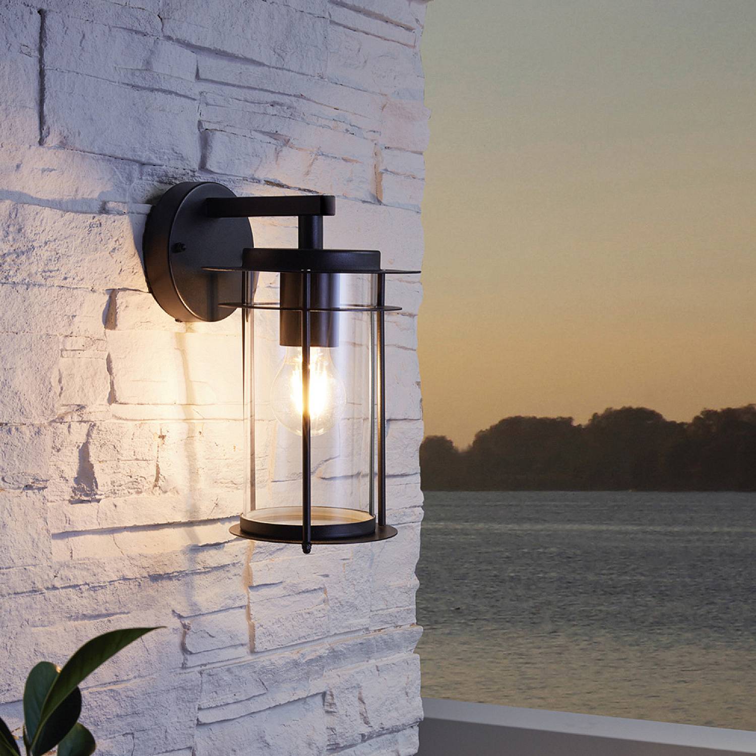 L’applique per esterni VALDEO ha un design che ricorda una lanterna. È composta da un corpo nero in metallo e un cilindro in vetro. Il cilindro consente di vedere direttamente la lampadina. L'alto grado di protezione (IP44) la rende resistente all'umidità e alla pioggia. La lampadina presente nell’immagine non è inclusa nella consegna. Per questa applique è adatta qualsiasi lampadina con attacco E27.