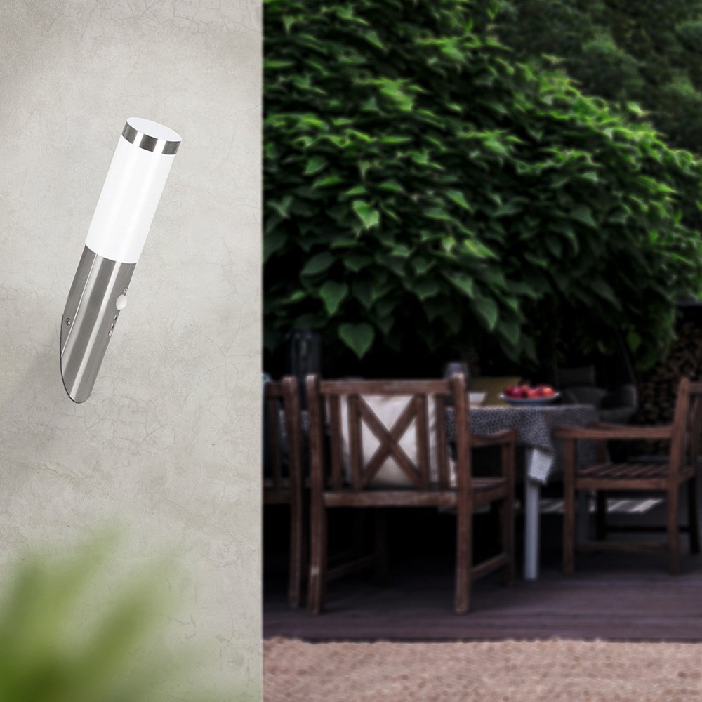La lampada da parete per esterni HELSINKI è caratterizzata da un corpo cilindrico in acciaio inox e il portalampada in plastica bianca. La lampada supporta tutti i tipi di lampadine E27, non inclusa, in modo da poter scegliere la luminosità e la potenza della luce. Il sensore incorporato permette di far accemdere la lampada solo quando rileva del movimento. Grazie al design moderno, questa lampada da parete si adatta a quasi tutti gli spazi esterni e fornisce un'illuminazione elegante per le pareti esterne della casa. Il prodotto è adatto per uso esterno grazie alla sua protezione IP44.