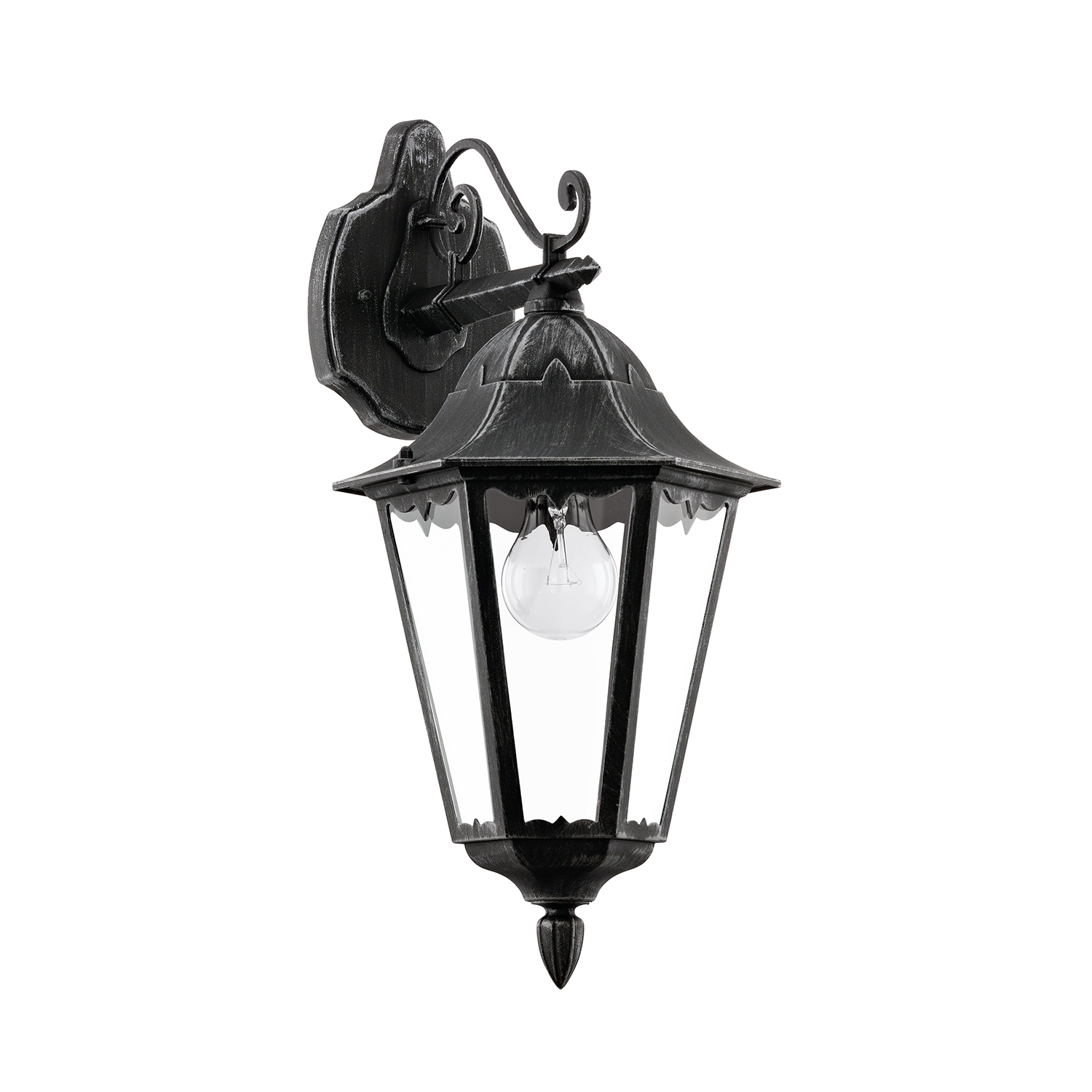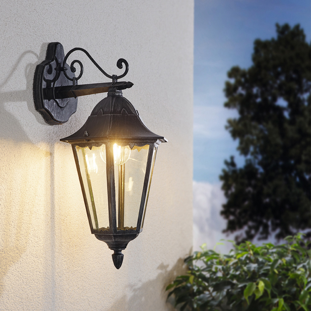 L’applique per esterni NAVEDO, con il design che ricorda una lanterna, ha un corpo nero in fusione di alluminio e argento patinato, con lastre di vetro chiare. Questa lampada per esterni ha un alto grado di protezione (IP44) che le consente di essere utilizzata senza problemi negli spazi esterni. Grazie al suo design classico, questa lampada si armonizza in ambienti esterni dai molteplici stili, offrendo un’illuminazione adeguata intorno alla casa, all'ingresso o sotto il portico o sul balcone. La lampadina presente nell’immagine non è inclusa nella consegna. Per la lampada è adatta qualsiasi lampadina con attacco E27.
