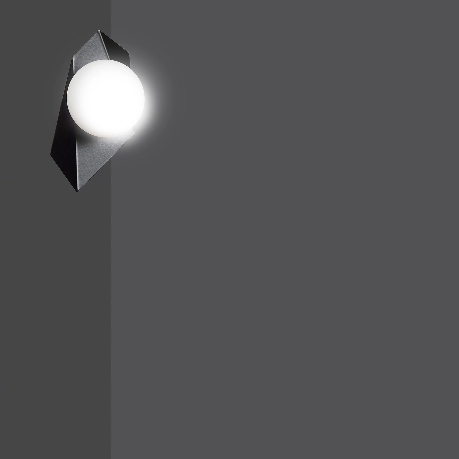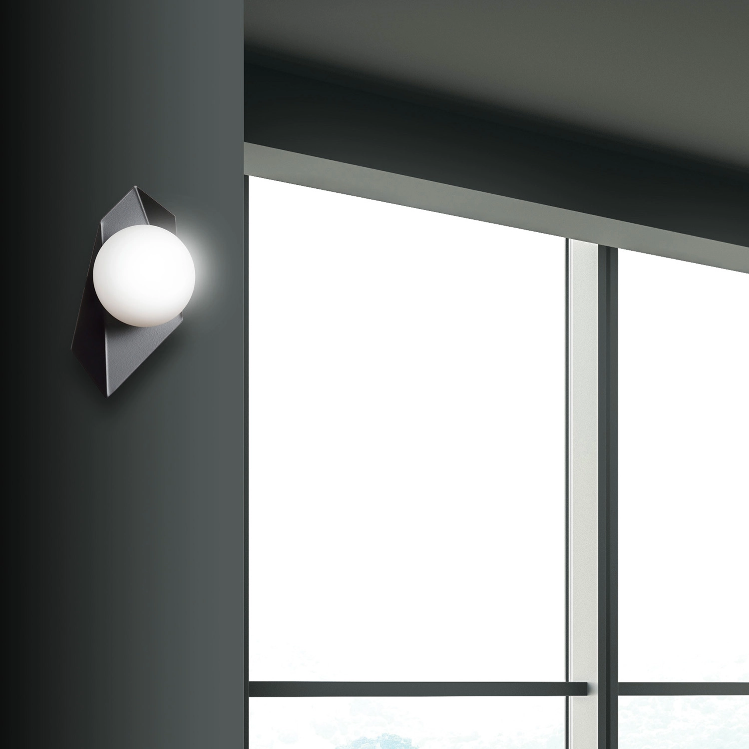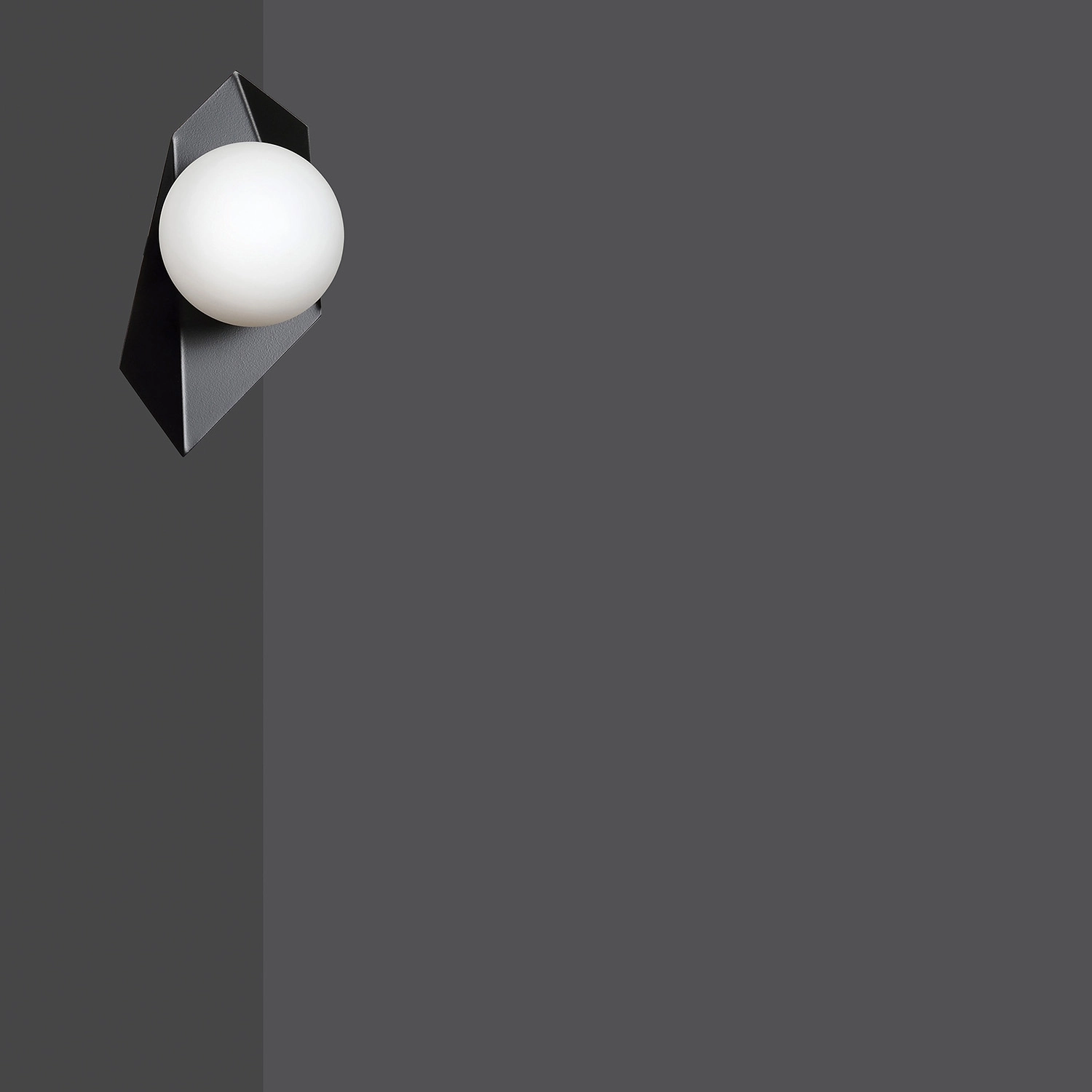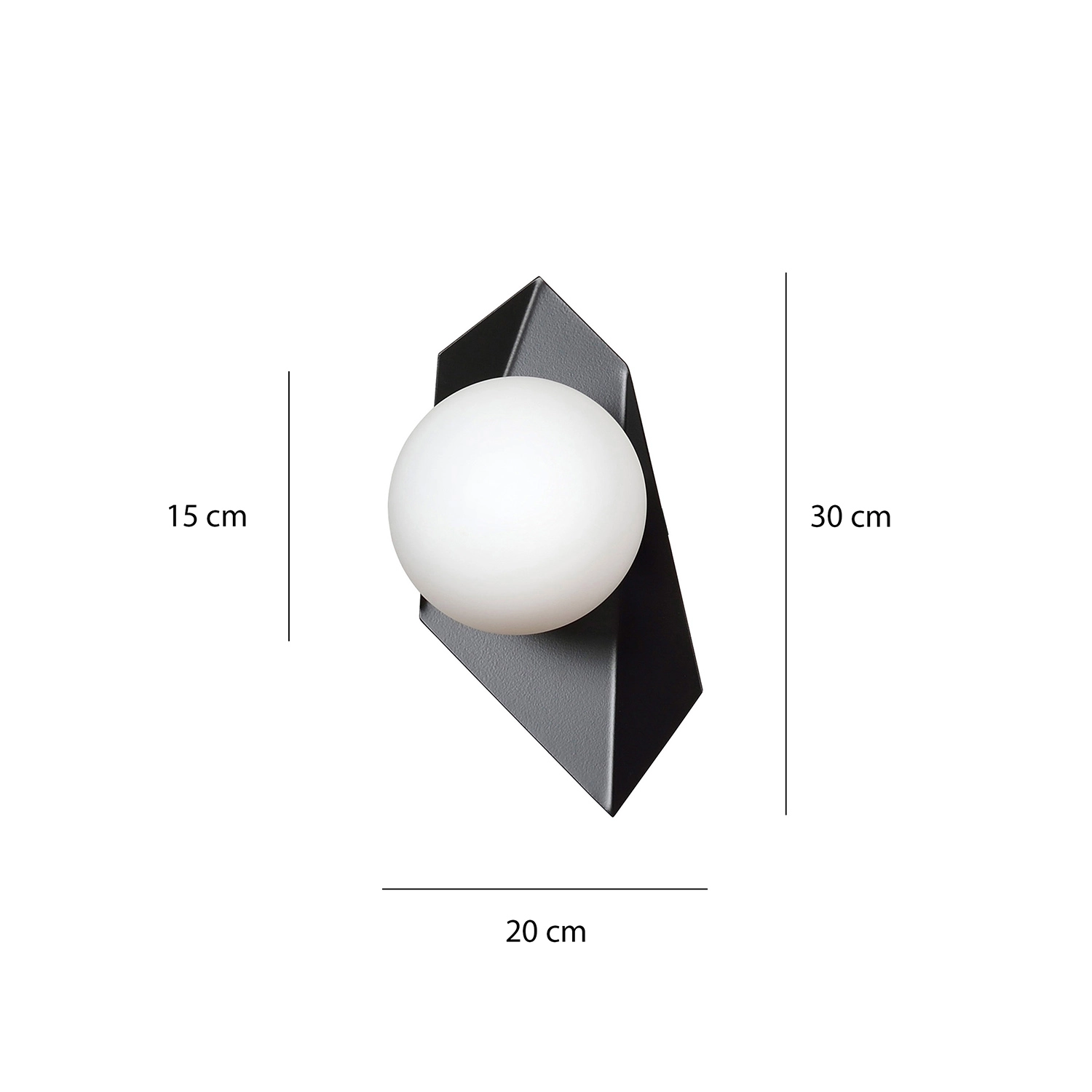 Moderna lampada da parete a 1 luce realizzata con base in metallo poligonale di colore nero e paralume sferico in vetro opalino. La luce funzionale e brillante di questa lampada da parete funzionerà perfettamente nel corridoio, nelle scale o nel soggiorno.