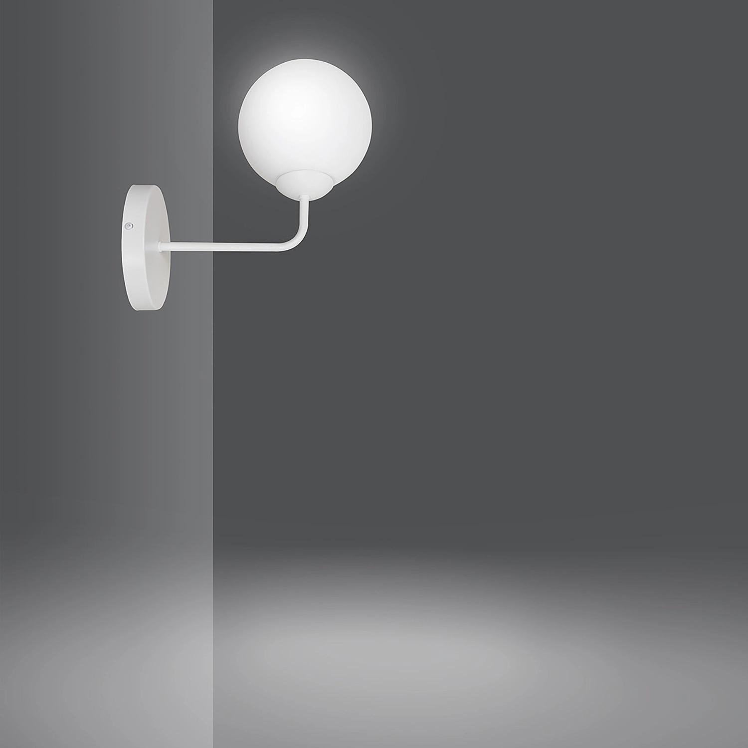 Applique moderna realizzata con una base rotonda in acciaio bianco con braccio e paralume in vetro di forma sferica di colore opale.. La delicata tonalità lattiginosa aggiunge eleganza e leggerezza alla serie. La forma minimalista dell'applique da parete PREGOS illumina perfettamente anche le grandi superfici e si adatta perfettamente alla maggior parte degli arrangiamenti domestici. È un design minimalista che garantisce il massimo effetto.