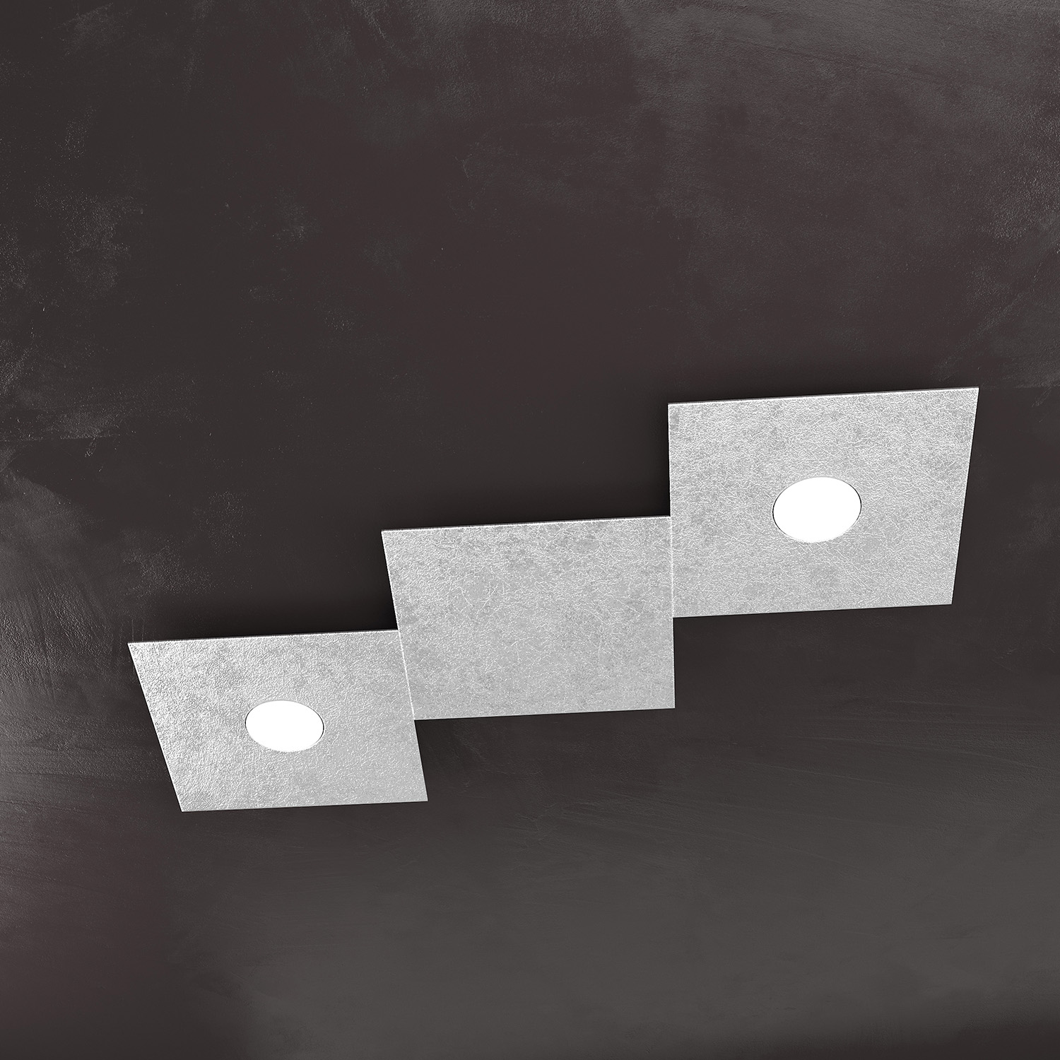 Collezione ECCENTRICLA LUCE ADATTABILE E FLESSIBILELampada 3 luci formata da due lastre quadrate di metallo verniciato in finitura foglia argento.. Queste lampade..