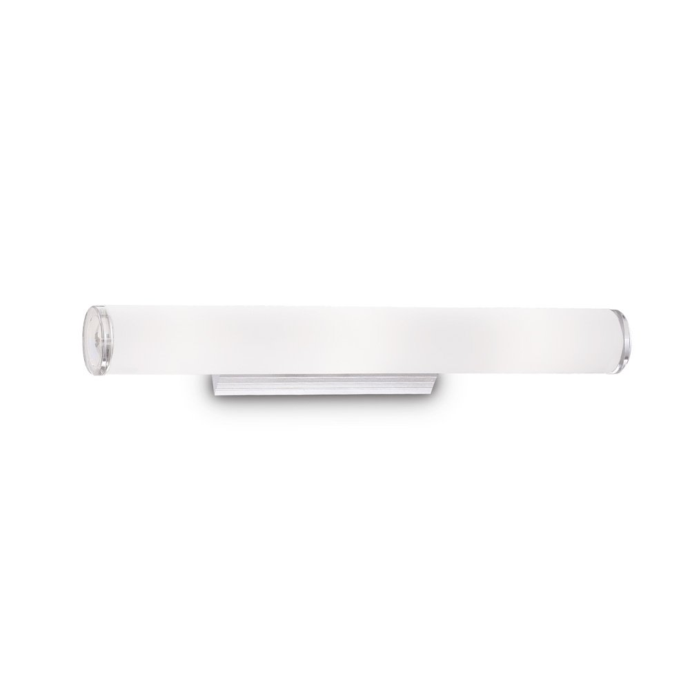 Applique a 3 luci con base in alluminio. Diffusore in vetro bianco soffiato e acidato, chiuso alle estremità da dischi in materiale acrilico trasparente..