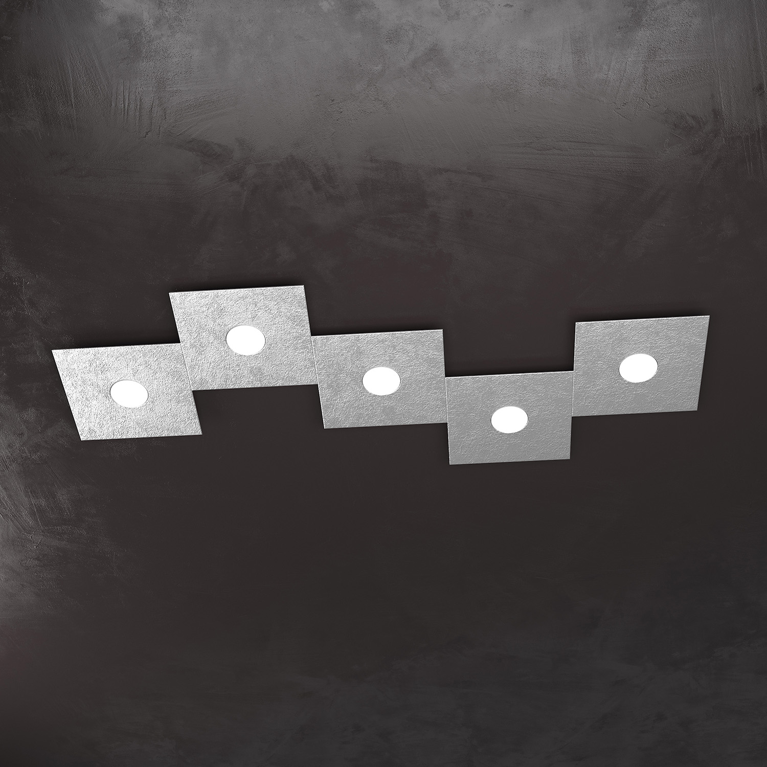 Lampada 5 luci formata da cinque lastre quadrate di metallo verniciato in finitura foglia argento.. Queste lampade sono componibili e personalizzabili, così puoi creare infinite forme e mix di colori. I componenti base sono due: uno con sorgente luminosa (1156/1L) e uno solo decorativo (1156/1D). Questi componenti possono essere assemblati fra loro per creare infinite forme e mix di colori. Per comodità vengono proposti alcuni kit precomposti con codice dedicato all' interno del sito. La presente collezione in quanto componibile è indicata per risolvere problemi di decentramento tra punto luce e zona da illuminare. Un altro punto di forza del prodotto consiste nel non utilizzare dei led integrati ma una lampadina Gx53 che, una volta montata, arriva a filo della lastra metallica e può essere facilmente sostituita dall’esterno. Scopri la Serie Eccentric e lasciati ispirare dalla sua versatilità e qualità.Questo articolo è disponibile in diverse finiture e/o dimensioni. E' possibile indicarlo nell'apposito campo NOTE presente in conclusione di ordine oppure contattarci dopo aver effettuato l'ordine.