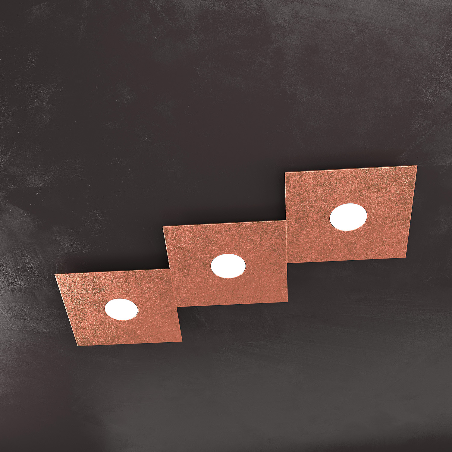 Lampada 3 luci formata da due lastre quadrate di metallo verniciato in finitura foglia rame.. Queste lampade sono componibili e personalizzabili, così puoi creare infinite forme e mix di colori. I componenti base sono due: uno con sorgente luminosa (1156/1L) e uno solo decorativo (1156/1D). Questi componenti possono essere assemblati fra loro per creare infinite forme e mix di colori. Per comodità vengono proposti alcuni kit precomposti con codice dedicato all' interno del sito. La presente collezione in quanto componibile è indicata per risolvere problemi di decentramento tra punto luce e zona da illuminare. Un altro punto di forza del prodotto consiste nel non utilizzare dei led integrati ma una lampadina Gx53 che, una volta montata, arriva a filo della lastra metallica e può essere facilmente sostituita dall’esterno. Scopri la Serie Eccentric e lasciati ispirare dalla sua versatilità e qualità.Questo articolo è disponibile in diverse finiture e/o dimensioni. E' possibile indicarlo nell'apposito campo NOTE presente in conclusione di ordine oppure contattarci dopo aver effettuato l'ordine.