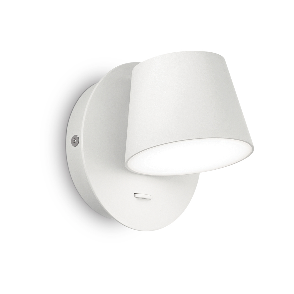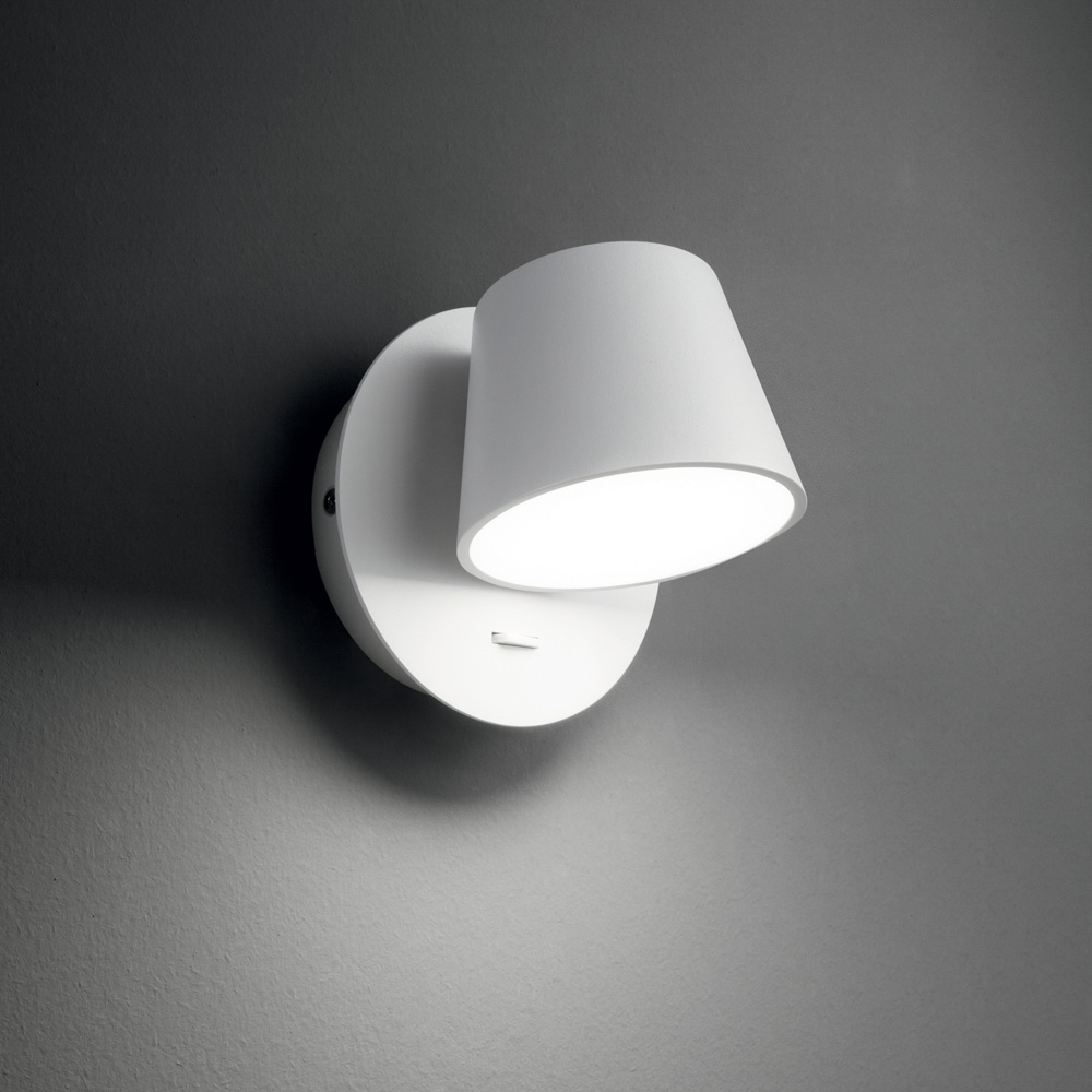 Applique moderna con montatura in alluminio verniciato a polveri bianca.. Diffusore ruotabile con schermo acrilico satinato. Interruttore incorporato. LED integrati.