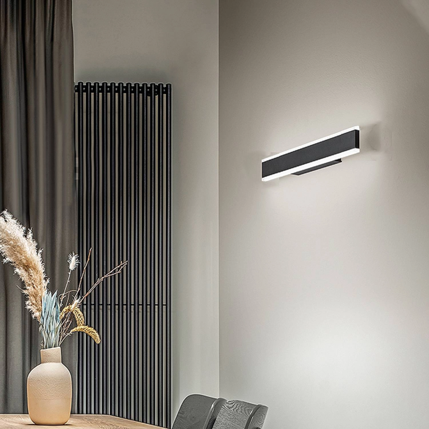 Applique LED struttura in metallo verniciato di colore nero, con un diffusore opaco in acrilico che garantisce una diffusione uniforme della luce. Dal design moderno e minimalista, adatta per l'illuminazione di interni, tecnologia LED, che rende questa applique è molto efficiente dal punto di vista energetico e ha una lunga durata. La luce emessa può essere facilmente regolata grazie al dimmer integrato, che permette di creare diverse atmosfere luminose a seconda delle esigenze.