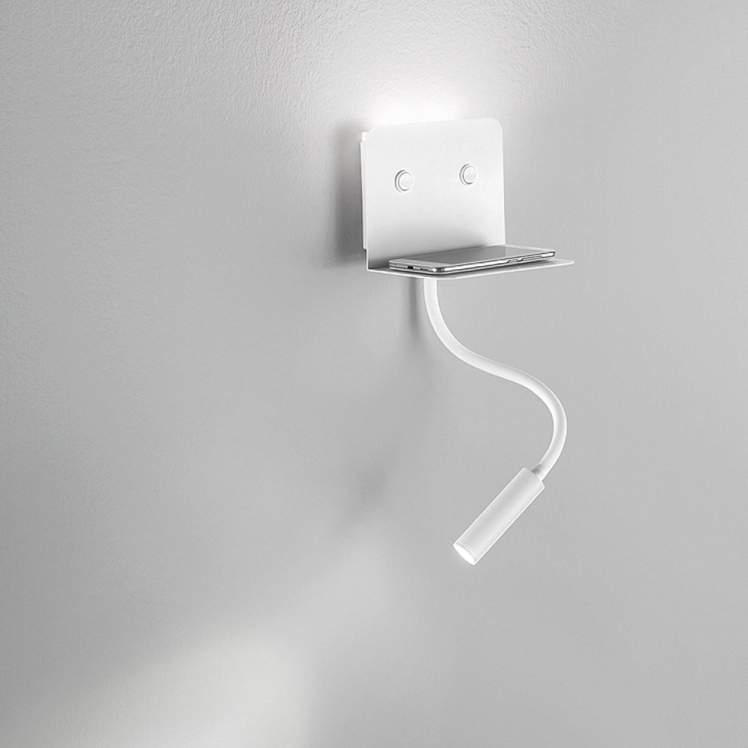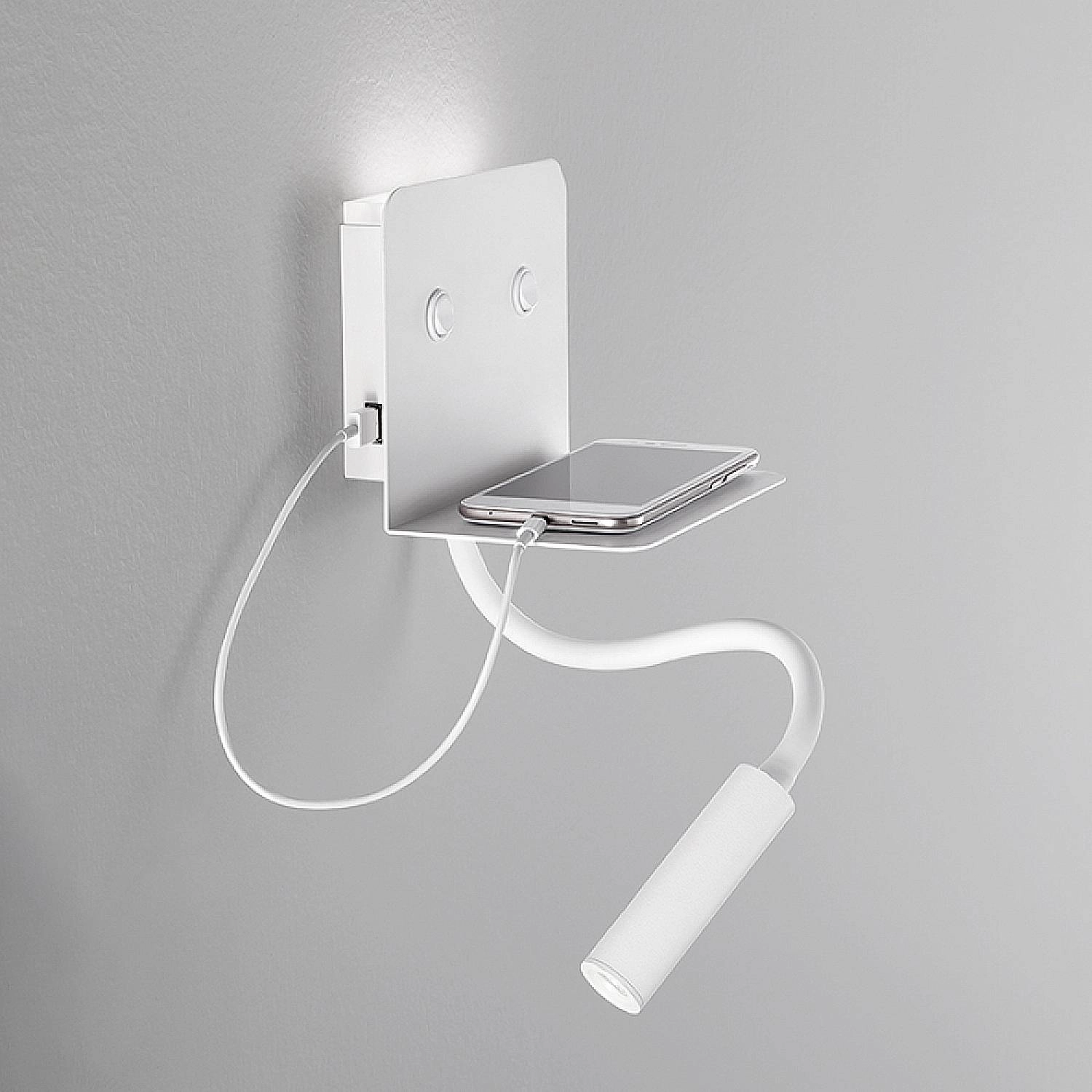 Applique realizzata in metallo verniciato di colore bianco. Design moderno è caratterizzato da un braccio flessibile che consente di orientare il fascio luminoso in modo preciso e da una comoda porta USB integrata nella base. Grazie alla sua versatilità, questa applique può essere utilizzata come luce da lettura vicino al letto o come luce d'accento in un soggiorno o in uno studio.