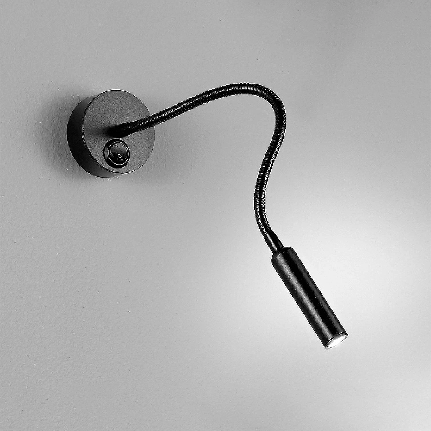 Applique realizzata in metallo verniciato nero, ha una forma lineare e minimalista che si adatta perfettamente a qualsiasi stile di arredamento. Grazie alla sua flessibilità, può essere orientata in modo da dirigere la luce dove serve di più. La lampada è alimentata a corrente elettrica con lampadina a LED, a risparmio energetico o a incandescenza.