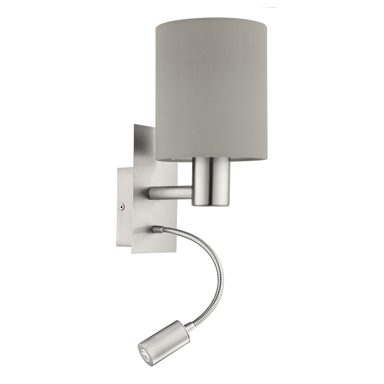L’applique PASTERI è composta da un corpo in metallo in nichel opaco e da un paralume cilindrico di stoffa color tortora.. La lampada dispone anche di una luce da lettura mobile e consente un’illuminazione mirata. È possibile accendere e spegnere la luce attraverso un interruttore a levetta presente sul corpo della lampada. Con il suo design semplice, è adatta a qualsiasi tendenza di arredamento o a qualunque ambiente che sia la camera da letto o il soggiorno. La lampadina, prevista con attacco E27, non è inclusa.