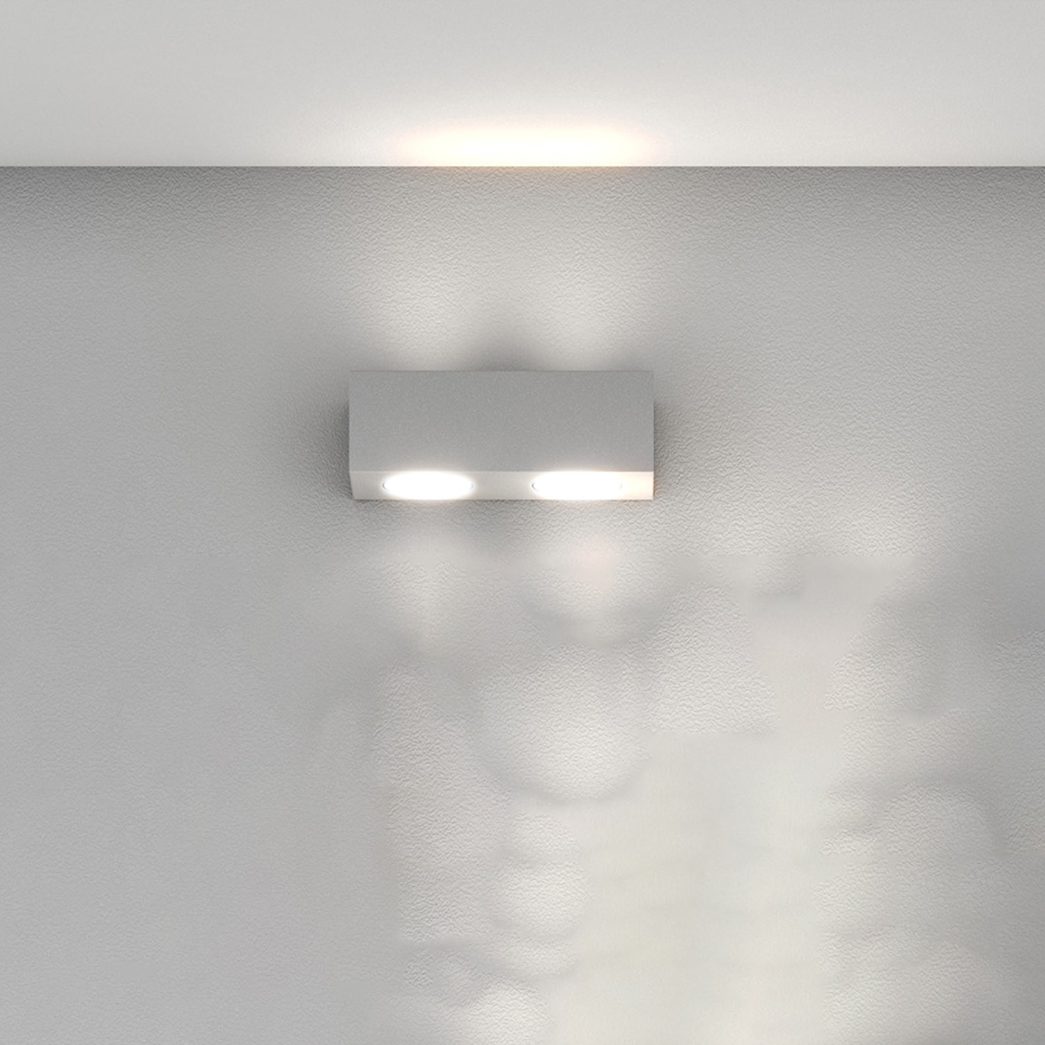 Collezione PLATEUN'ILLUMINAZIONE SENZA LIMITI, UN DESIGN SENZA COMPROMESSIApplique 2 luci biemissione di finitura grigio, realizzata con lastre quadrate di metallo s..