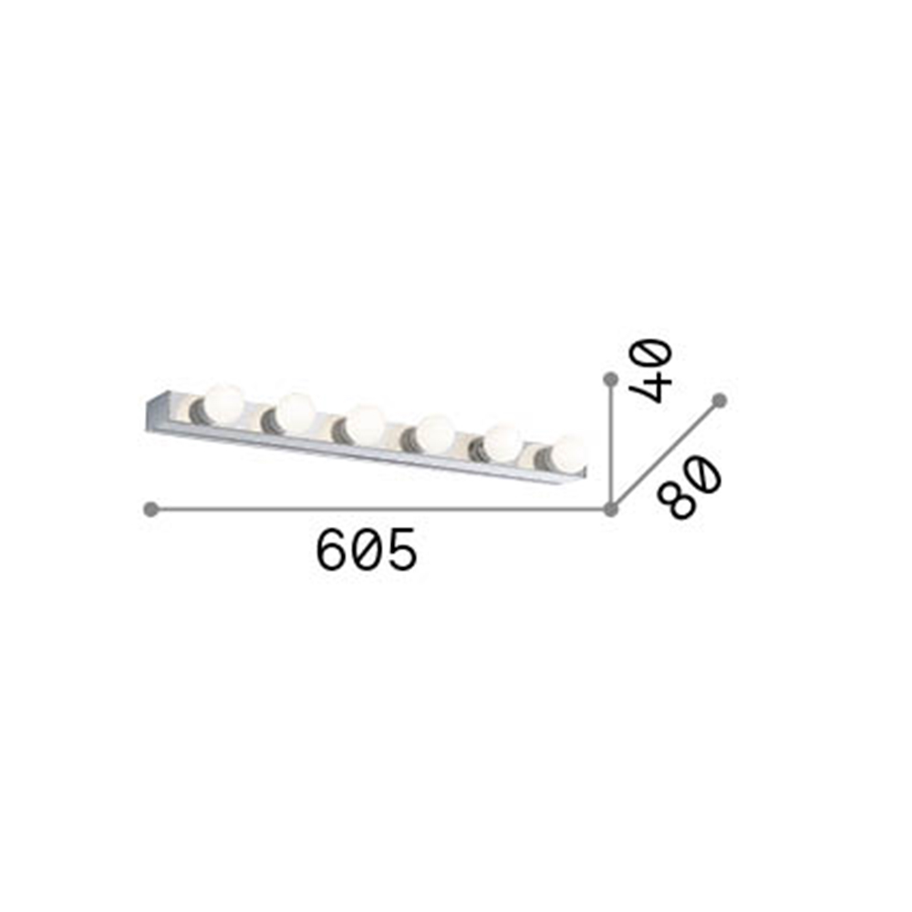 Applique a 6 luci con corpo luce interamente in metallo cromato. L’assenza di diffusore consente di montare una vasta gamma di lampade con attacco E14..