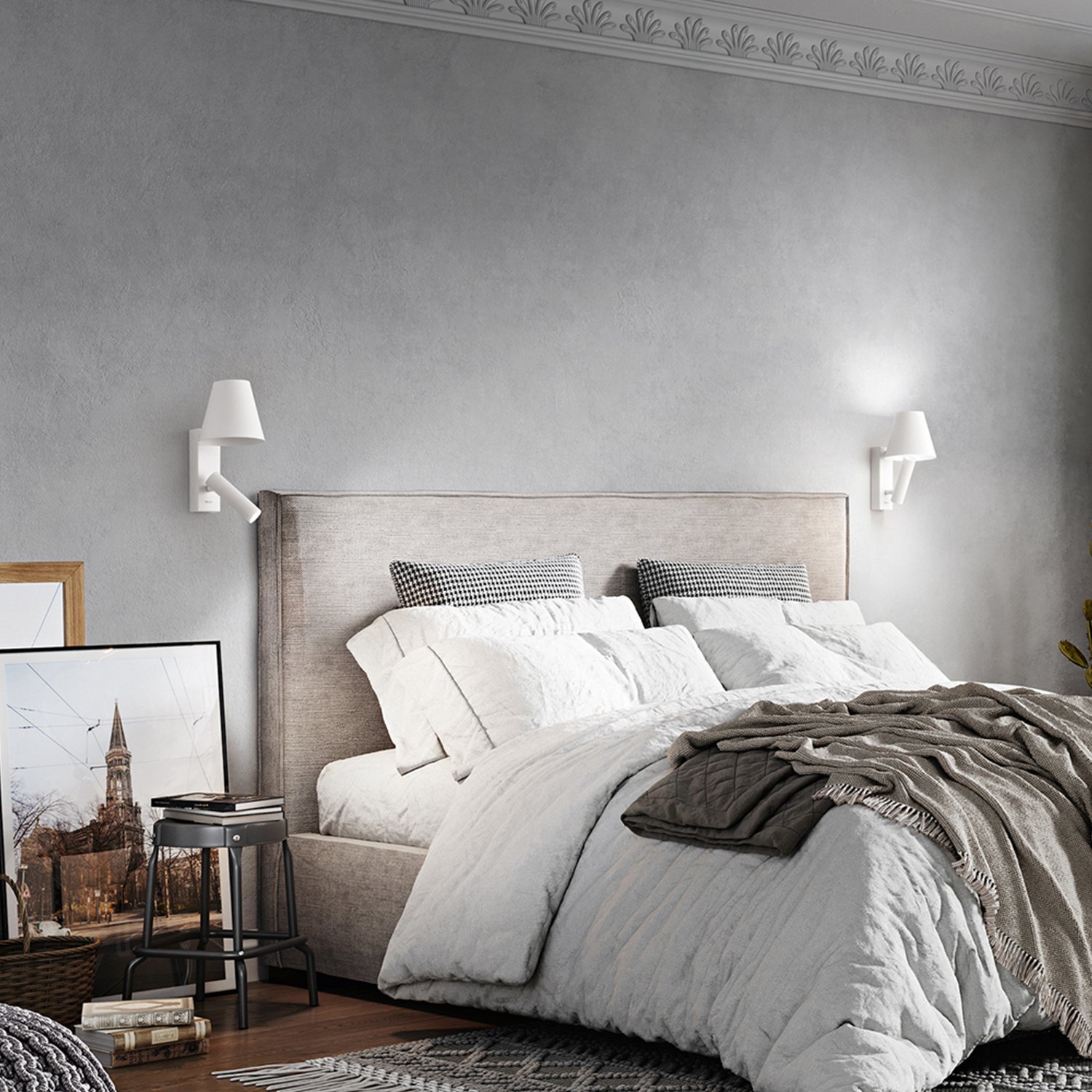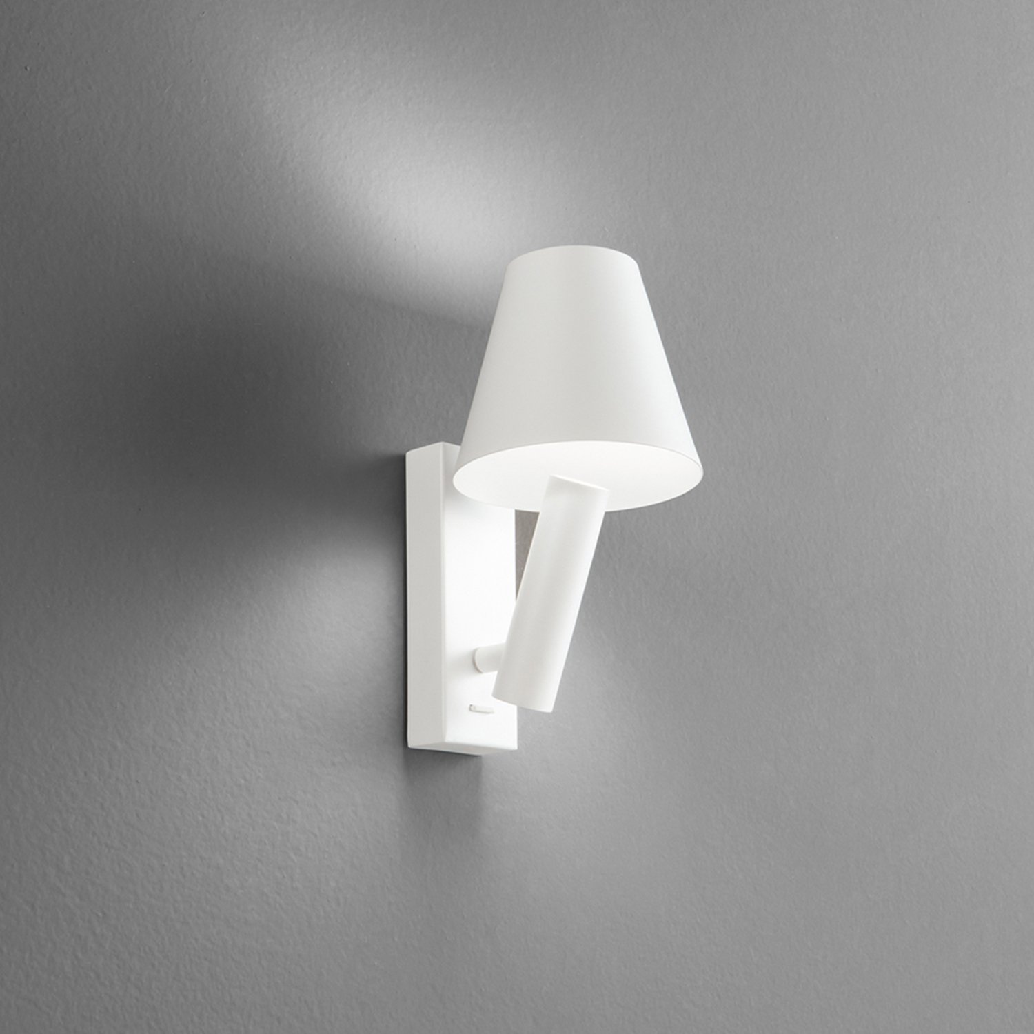 Collezione con struttura in metallo e alluminio verniciato a polvere nelle varie finiture. Corpo luce orientabile, con la possibilità di far riflettere la luce direttamente all'interno del diffusore conico. Colore: bianco opaco Pr.16 x H.22 cm Paralume D.12 x H.10 cm Faretto D.3 x L.11 cm LED 6W 3000K CRI.90 220-240V 50/60Hz IP20 - Classe I 480Lm lumen prodotto 600Lm lumen sorgente 40.000h durata led Interruttore on/off sulla base