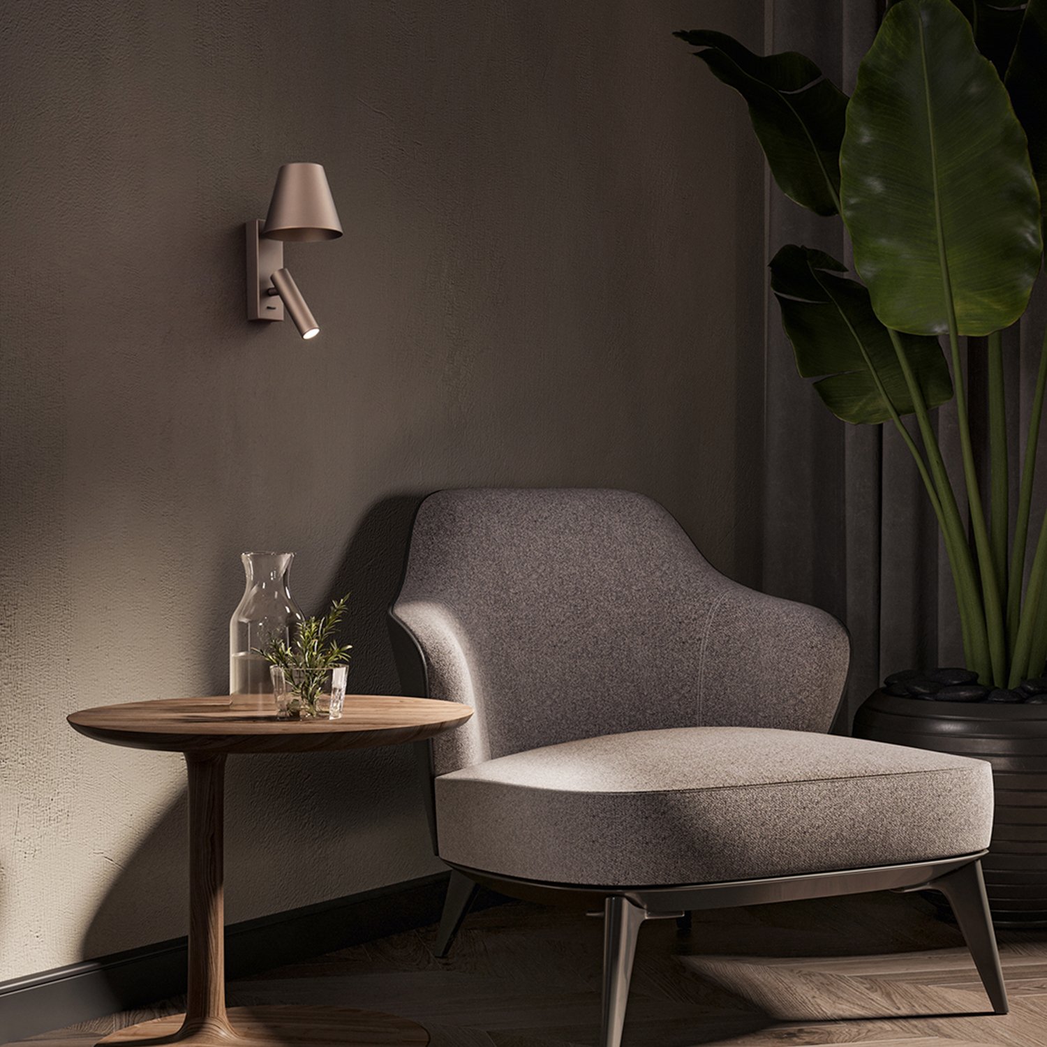 Collezione con struttura in metallo e alluminio verniciato a polvere nelle varie finiture. Corpo luce orientabile, con la possibilità di far riflettere la luce direttamente all'interno del diffusore conico. Colore: marrone metallizzato Pr.16 x H.22 cm Paralume D.12 x H.10 cm Faretto D.3 x L.11 cm LED 6W 3000K CRI.90 220-240V 50/60Hz IP20 - Classe I 480Lm lumen prodotto 600Lm lumen sorgente 40.000h durata led Interruttore on/off sulla base