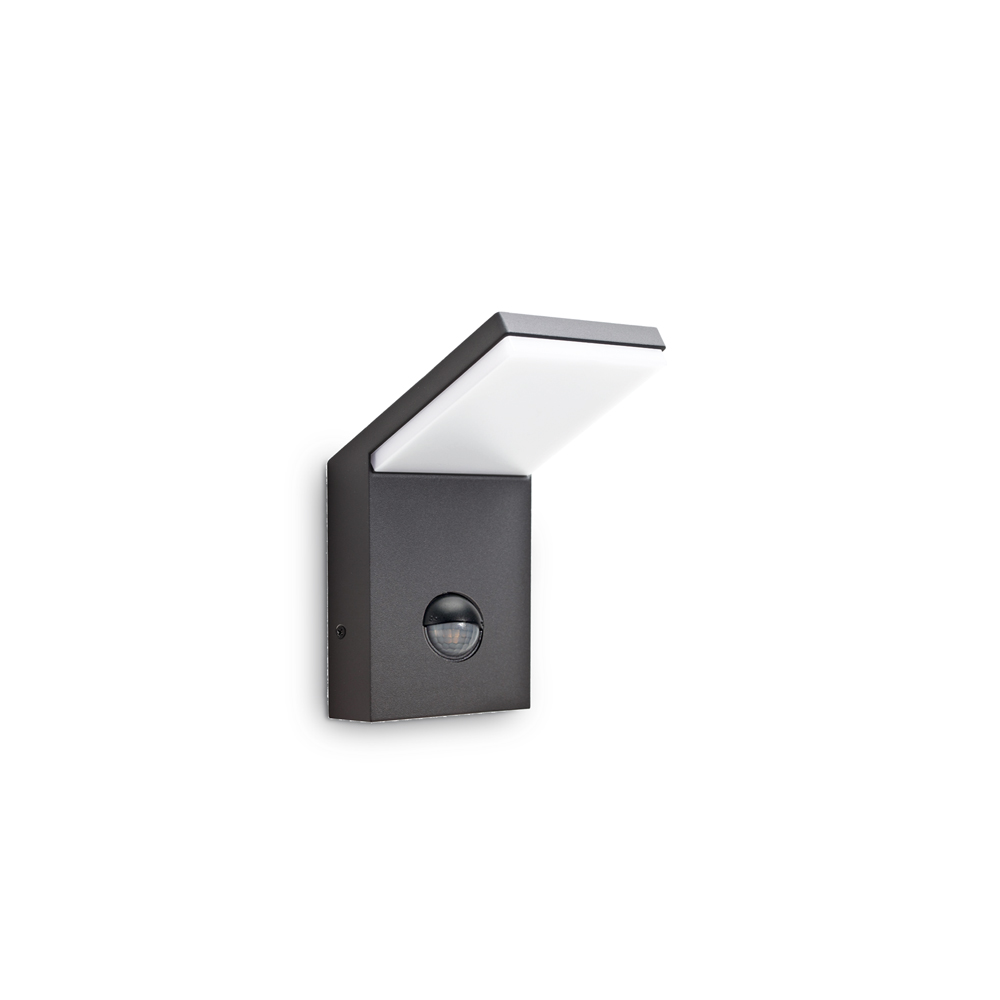 Applique per esterno con corpo luce 10 cm in alluminio verniciato a polveri. Diffusore obbliquo in materiale plastico opale.. Sorgente luminosa a led integrato 9,5 W. Modello AP Sensor dotato di sensore PIR. Disponibile nelle finiture antracite o bianco.