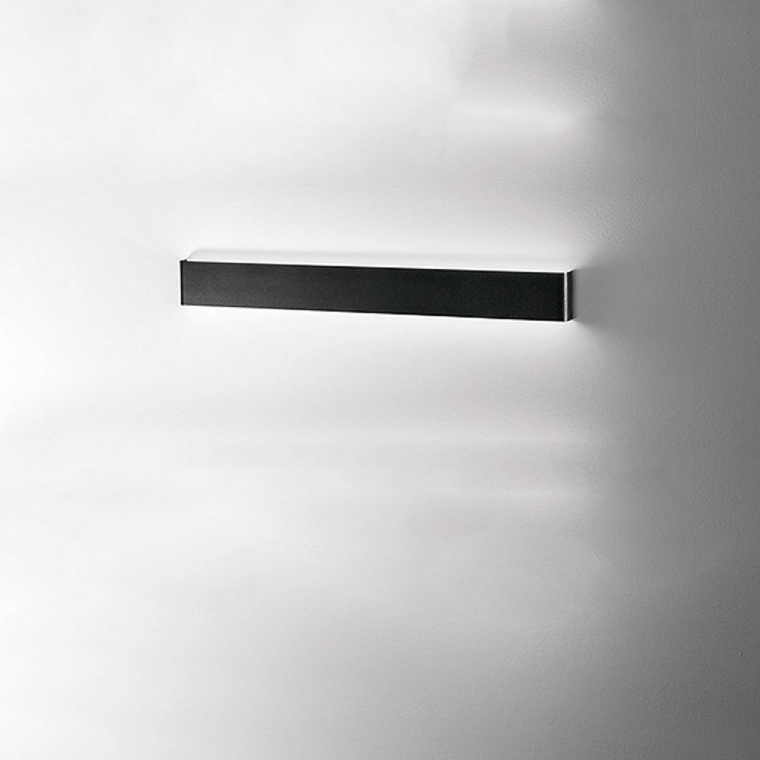 Applique in metallo nero, forma rettangolare con una sottile linea di luce a LED lungo il bordo, che crea un effetto di illuminazione a doppio fascio. Grazie alla sua versatilità, si adatta perfettamente a qualsiasi tipo di arredamento, dal più classico al più contemporaneo.