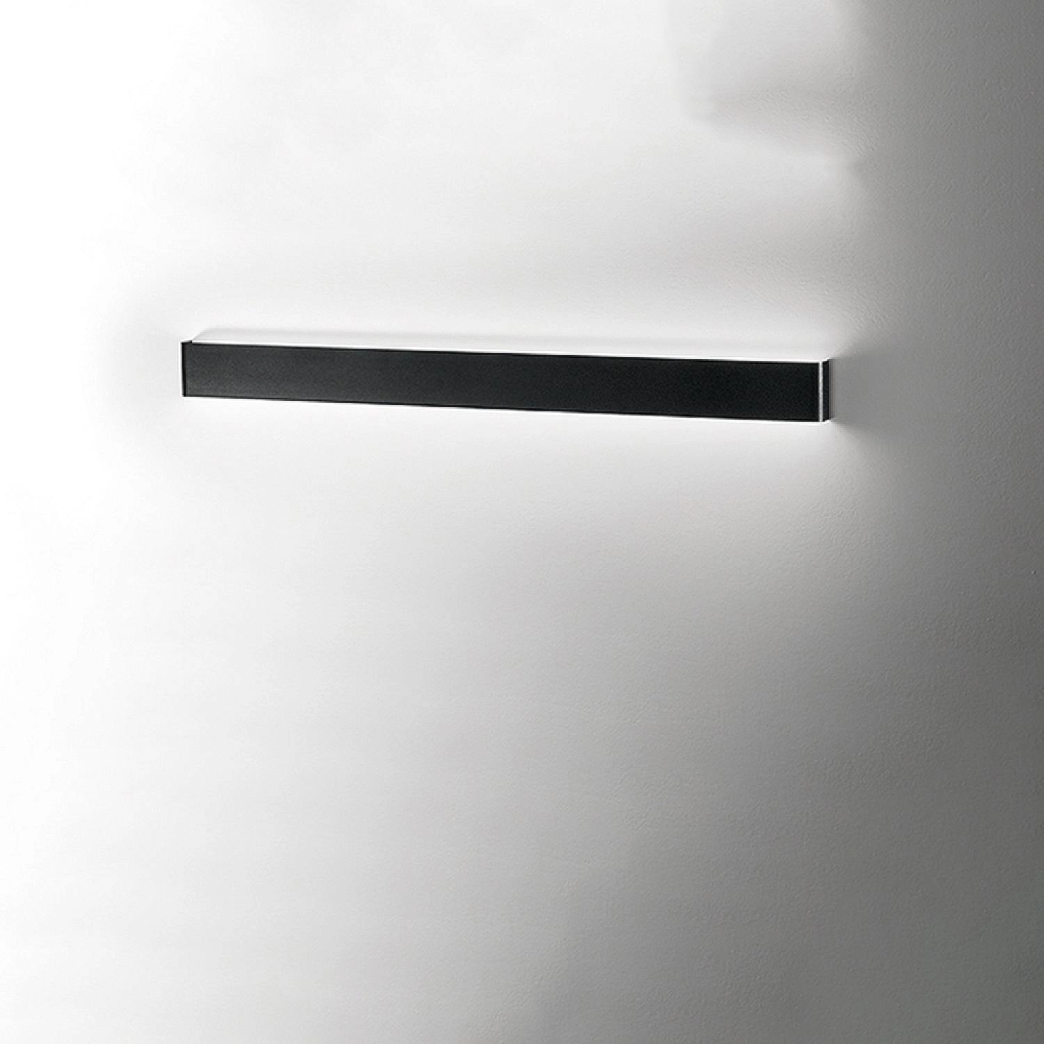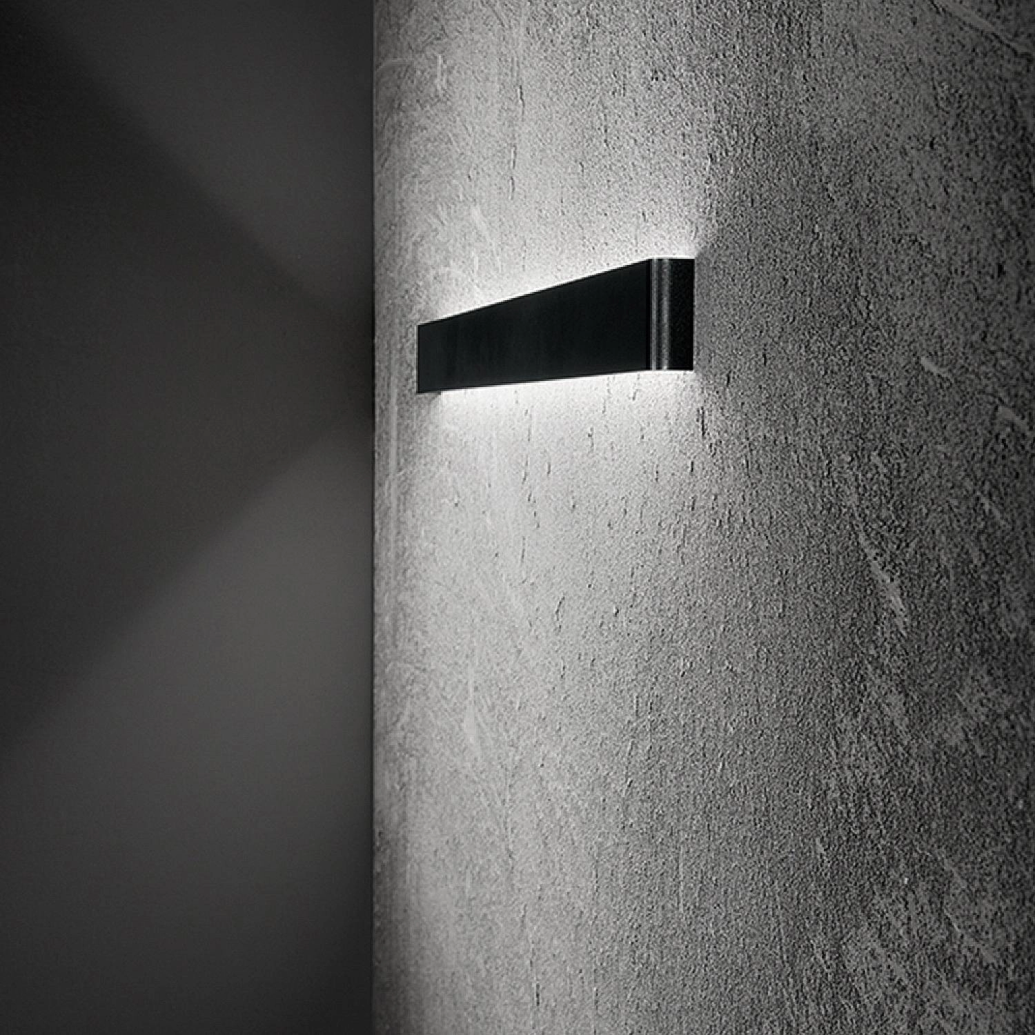 Applique in metallo nero, forma rettangolare con una sottile linea di luce a LED lungo il bordo, che crea un effetto di illuminazione a doppio fascio. Grazie alla sua versatilità, si adatta perfettamente a qualsiasi tipo di arredamento, dal più classico al più contemporaneo.