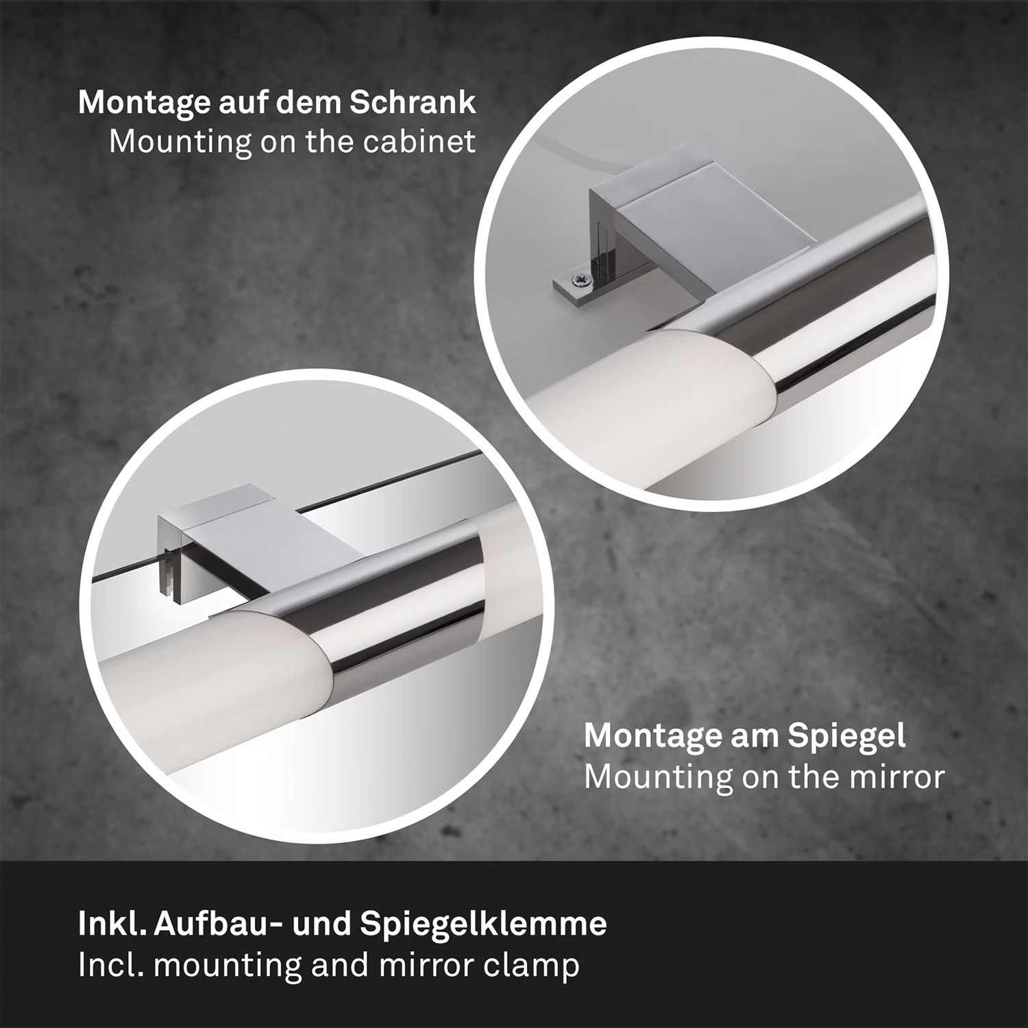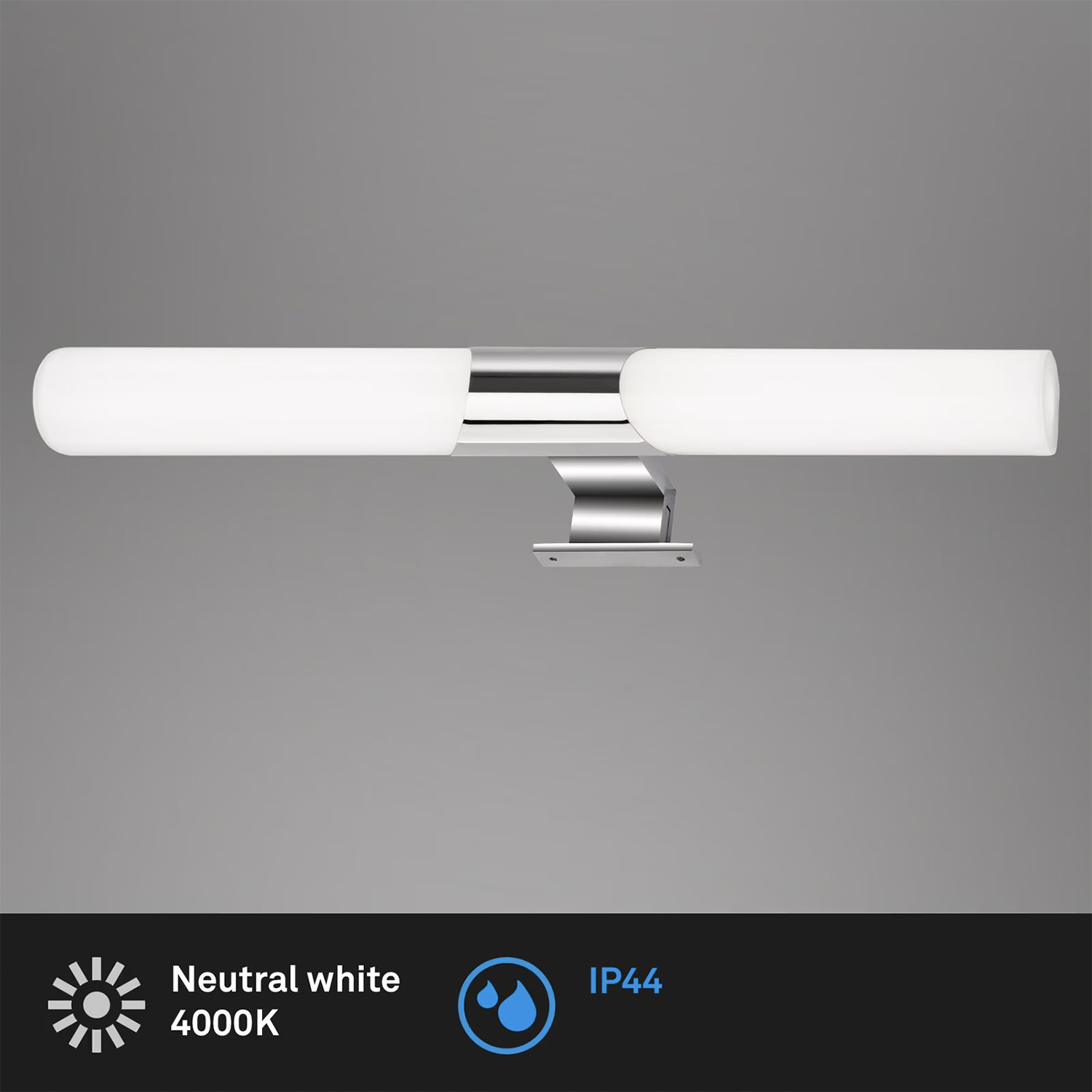 La lampada a specchio LED color cromo ha una certificazione di protezione IP44 ed è quindi perfetta per bagni e bagni per gli ospiti. La luce del bagno protetta da Splash può essere attaccata a un mobile a specchio esistente o inserita su uno specchio. La lampada a specchio è collegata alla griglia di alimentazione e può essere controllata tramite l'interruttore della luce (nessuna spina). L'alloggiamento di plastica lattiginosa funge da diffusore, che riduce il bagliore e diffonde la temperatura del colore bianco neutro di 4000 Kelvin con una luminosità di 1300 lumen. È ideale per applicare trucco o rasatura. La lampada dell'armadio a LED può anche essere utilizzata come luce immagine. Ha dimensioni 470x120x50 mm (BXTXH).