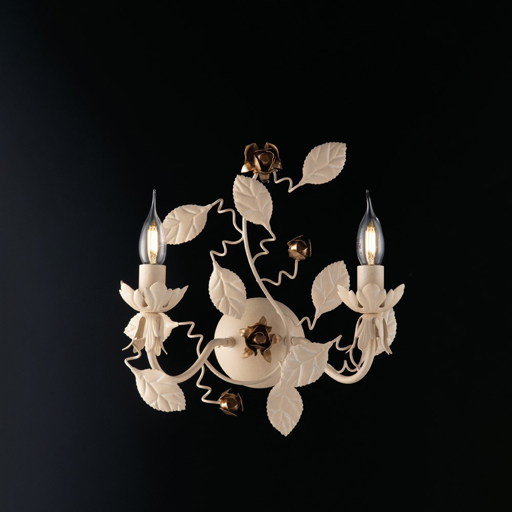 La applique Bella avorio è una lampada da parete dal design elegante e raffinato.. La lampada da parete a 2 luci è realizzata in metallo avorio con decori in foglie e rose color oro. Una lampada che unisce stile e funzionalità, perfetta per dare un tocco shabby chic al tuo arredo. Tutti i nostri articoli sono prodotti esclusivamente in Italia e rispettano rigorosamente le normative CE. Prodotti realizzati per la maggior parte dei casi senza l'ausilio delle macchine salvo qualche eccezione in cui, le stesse, sono utilizzate in modo marginale. Le piccole imperfezioni e le variazioni nelle misure sono, quindi, non da attribuirsi ad un difetto di fabbricazione quanto alla particolarità ed alla composizione stessa del prodotto interamente confezionato a mano. Essendo prodotti realizzati artigianalmente, su richiesta è possibile effettuare piccole modifiche o personalizzazioni al prodotto.