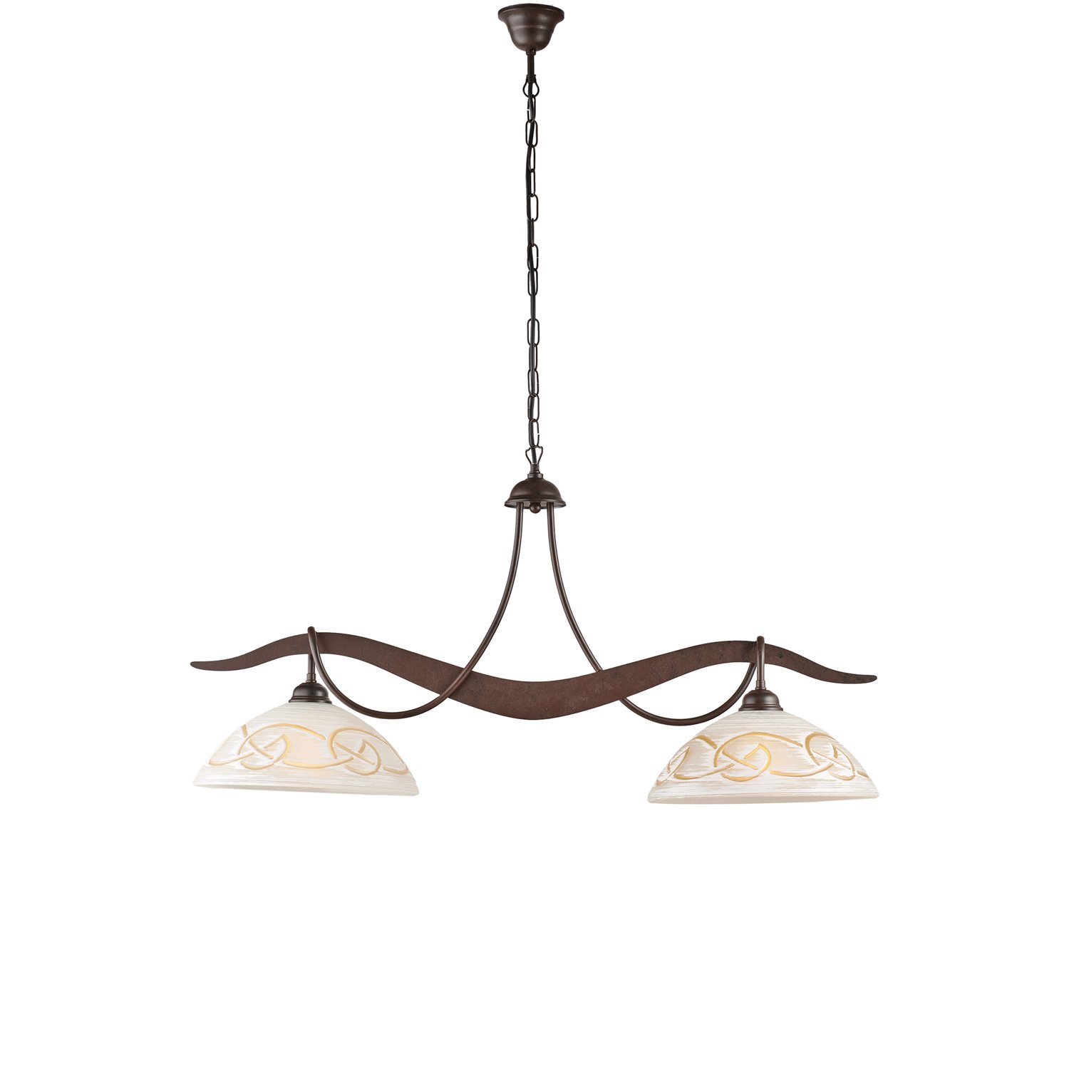 Bilanciere a 2 luci con struttura in ferro laccato nero con decorazione effetto ruggine. . I diffusori sono in vetro centrifugato decorato a mano bianco e ambra. Il mix di materiali rustici e finiture eleganti conferisce a questa sospensione un fascino country chic che si adatta perfettamente a uno stile di arredamento rustico, ma con un tocco di raffinatezza. Unisce infatti robustezza e delicatezza in modo armonioso, creando un'atmosfera accogliente e affascinante. La combinazione di materiali e colori conferisce un tocco di carattere e autenticità, perfetto per arricchire e valorizzare gli spazi domestici con un'estetica rustica e ricercata.