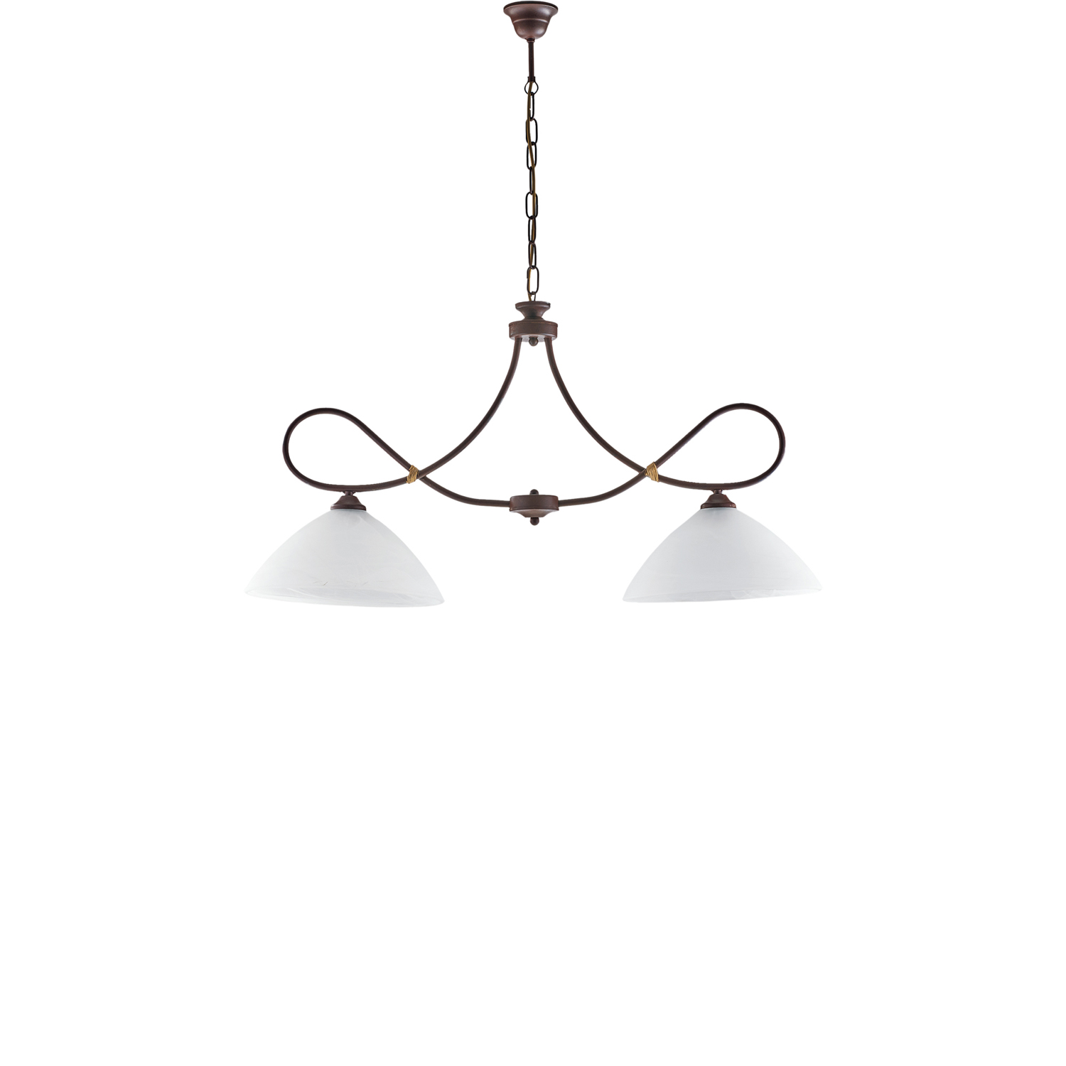 Bilanciere 2 luci in ferro laccato nero con decorazione effetto ruggine. . Interamente lavorato da mastri artigiani italiani che, con le tecniche tramandate negli anni, eseguono manualmente la curvatura dei bracci che conferiscono all'intera serie una linea morbida e sinuosa, ispirato al design country chic. L'altezza si può regolare grazie alla catena in dotazione. L'articolo si completa con degli ampi diffusori in vetro centrifugato alabastro bianco a contrasto con la montatura scura. Disponibile anche nella versione decapé avorio.