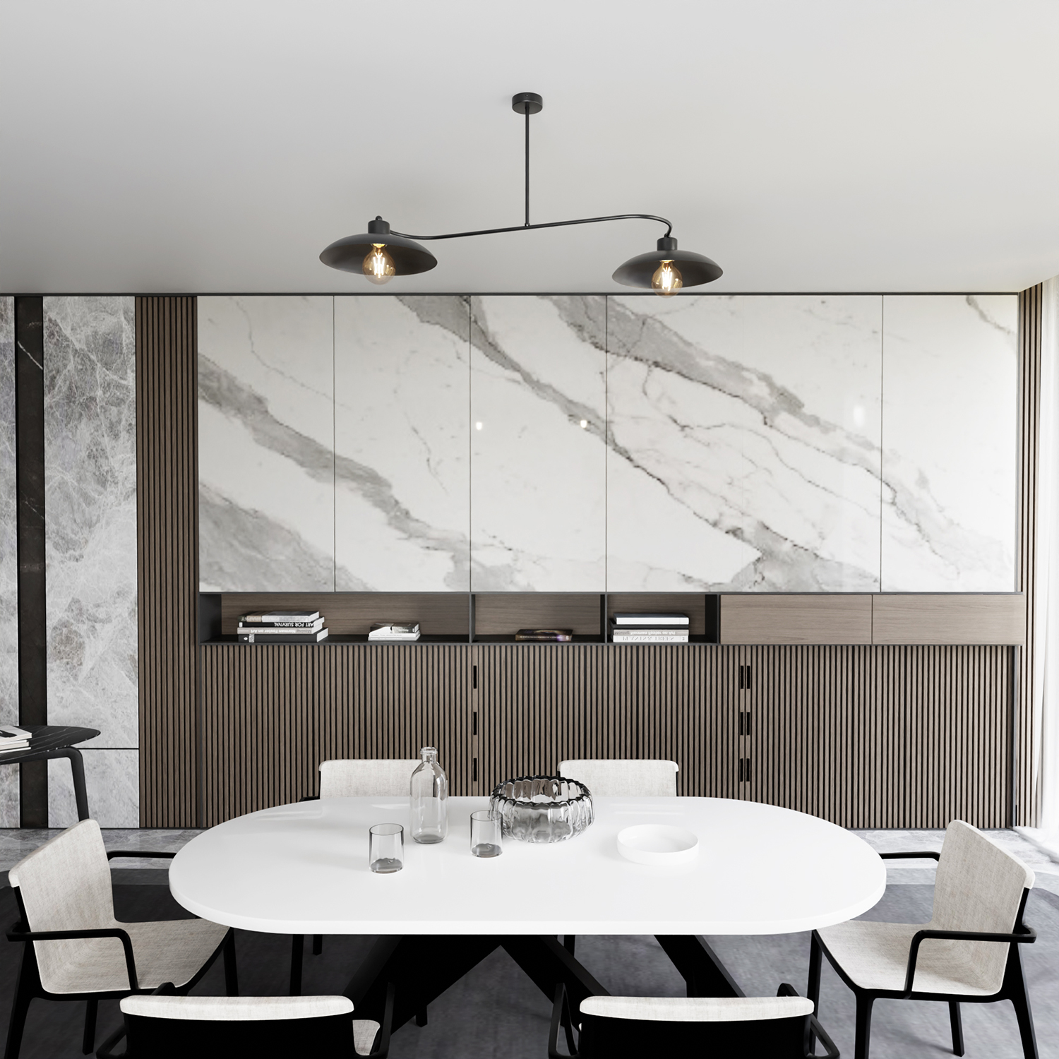 Lampadario stile industriale 2 luci in acciaio nero con base tonda e due diffusori a cupola. La struttura è realizzata interamente in acciaio nero, conferendo al prodotto un aspetto elegante e resistente, ideale sia per interni dal look industriale che per ambienti più contemporanei e minimalisti. I diffusori focalizzano la luce verso il basso, creando un'illuminazione funzionale e accogliente; ciò rende il bilanciere adatto per l'illuminazione di superfici come tavoli da pranzo, banconi da cucina, o isole centrali, dove un'illuminazione diretta e ben distribuita
