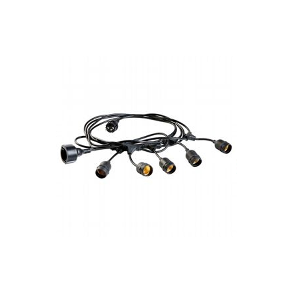 Cavo per esterno in termoplastico nero, lungo 5 mt con 5 portalampada E27 completo di spina e presa schuko.. Con il suo design si inserisce in maniera discreta nei vari ambienti esterni. Si adatta in modo efficace e naturale in molteplici contesti diversi come: pergole, terrazzi coperti o sotto gli ombrelloni in giardino. Alimentazione 230V; luce diretta. Disponibile anche in bianco.